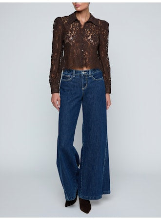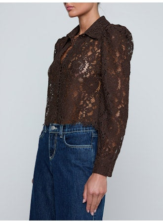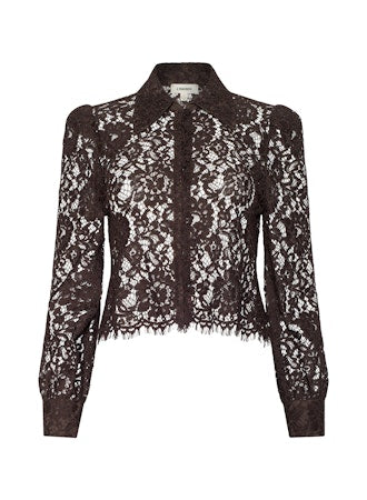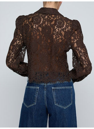 Crafted from refined floral lace, the Anita blouse features a pointed collar, long sleeves, and a scalloped hem for a romantic finish. Puffed shoulders add to its feminine look.