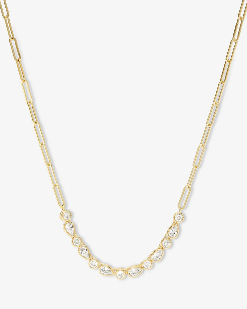 Vacation mode: on. A tennis necklace with a chain twist is a must have in any jewelry box. The Isla Samantha Tennis Necklace is glamour and comfort, perfect for those endless vacation days.