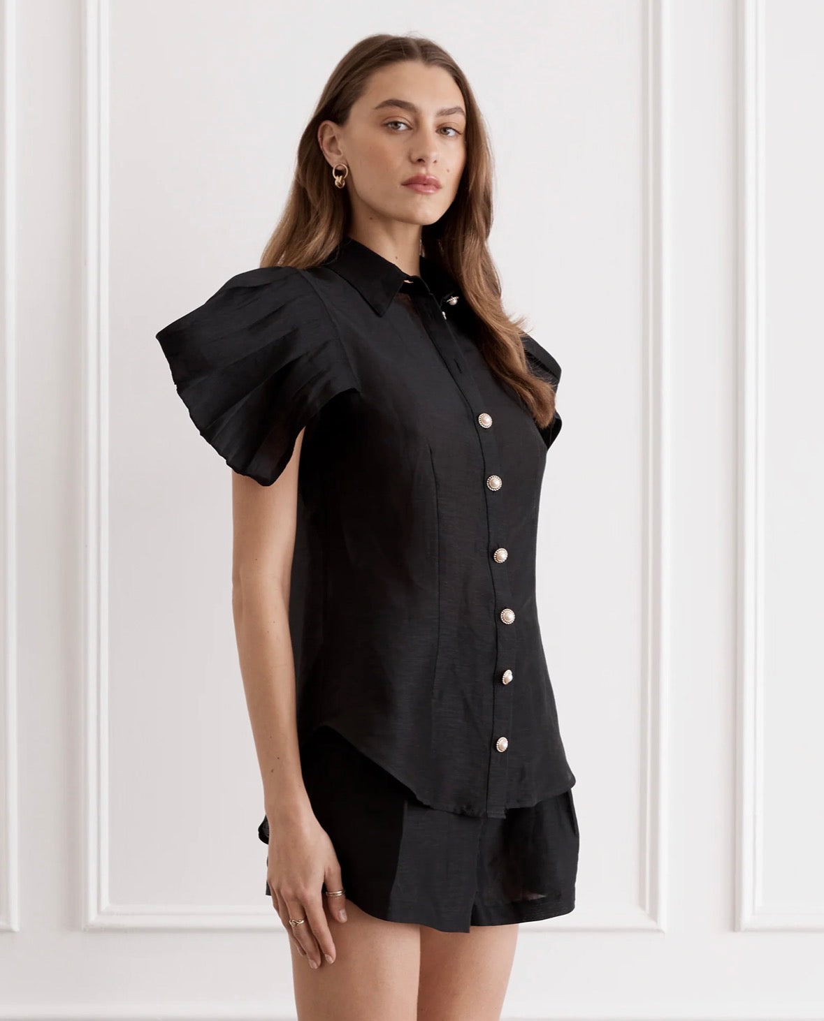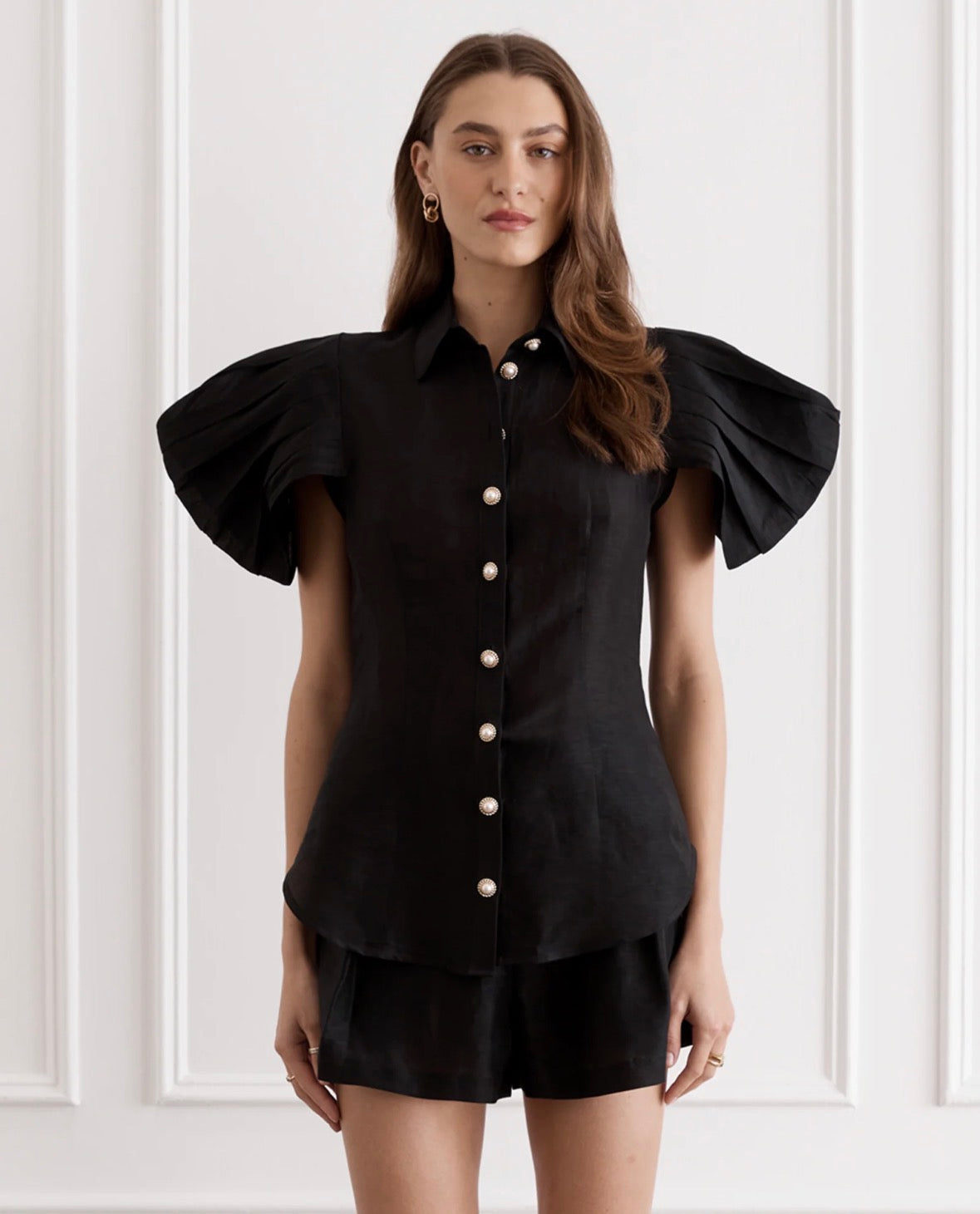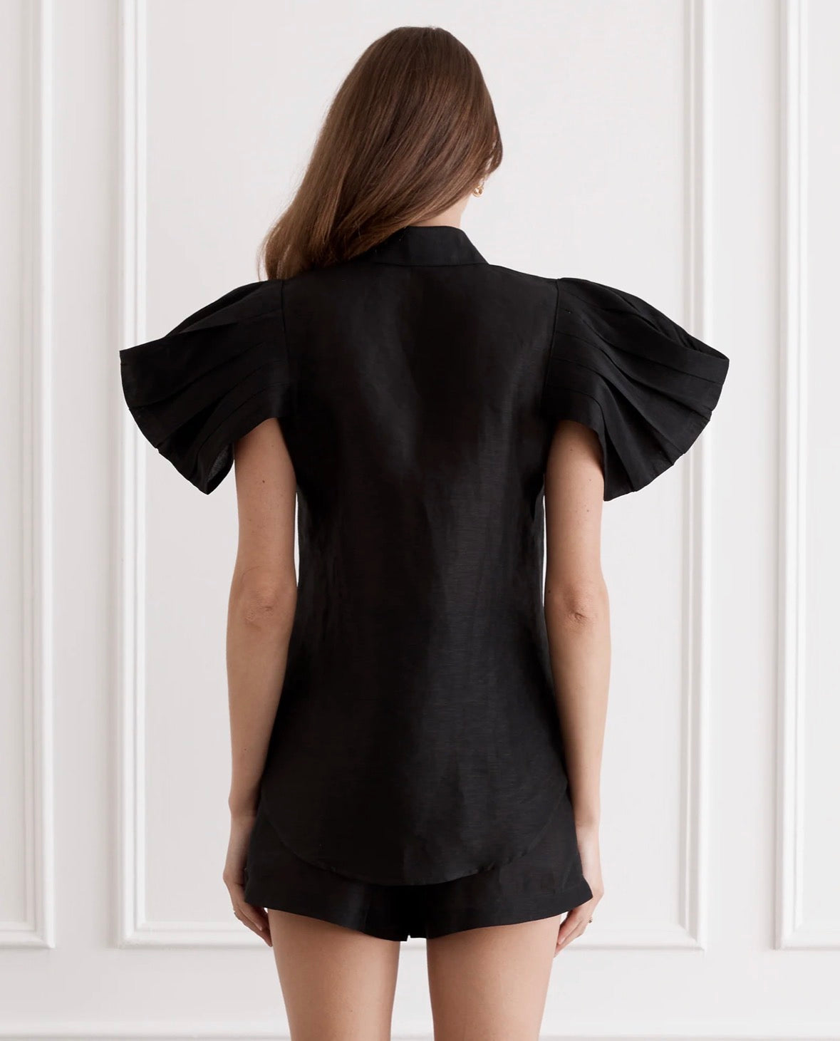 The Vivien Top adds a bold statement to trans-seasonal outfitting. Woven from the strength of French Linen and the decadent fluidity of Mulberry Silk, allowing it to hold both structure and softness. Pleated ruffle sleeves meet a form-fitting silhouette, a harmonious blend of romance and sophistication.