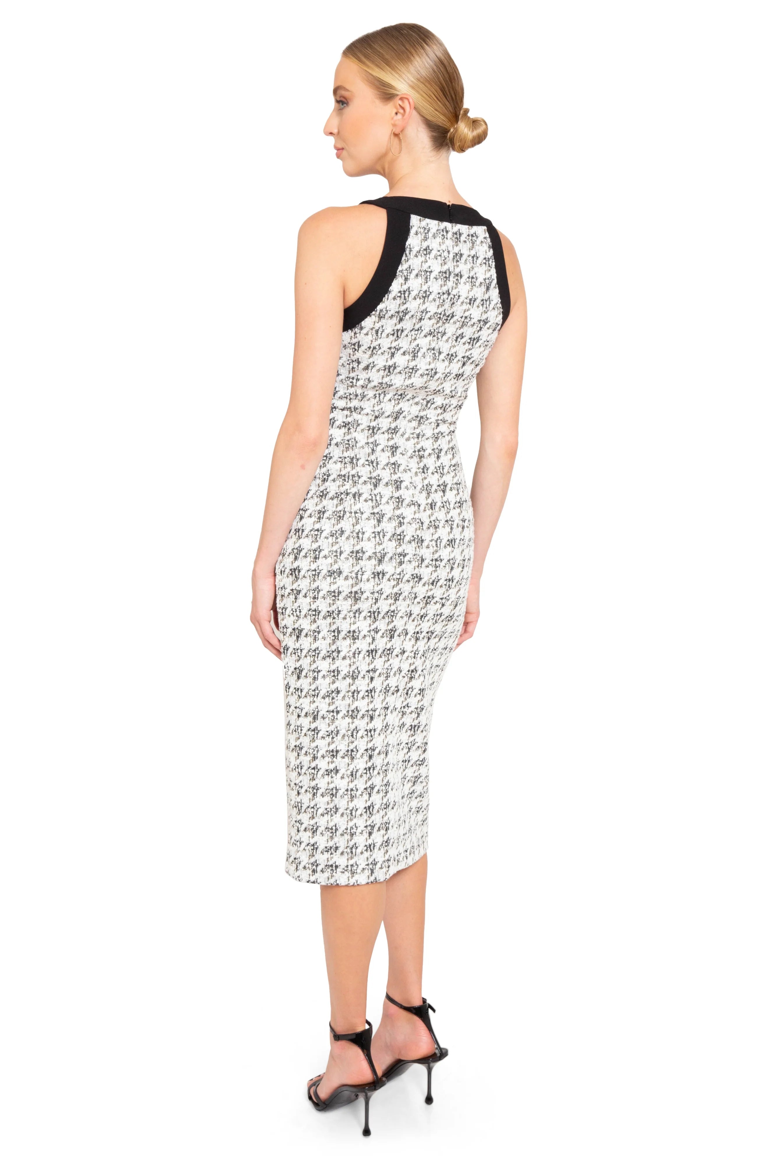 Unleash your inner goddess with the Aura Midi Dress in classic luxe black halo. This midi-length dress features a fitted silhouette, sleeveless design, and hidden back zipper for a sleek look. The contrast trim and gold button embellishments add a touch of elegance, making it perfect for any special occasion.