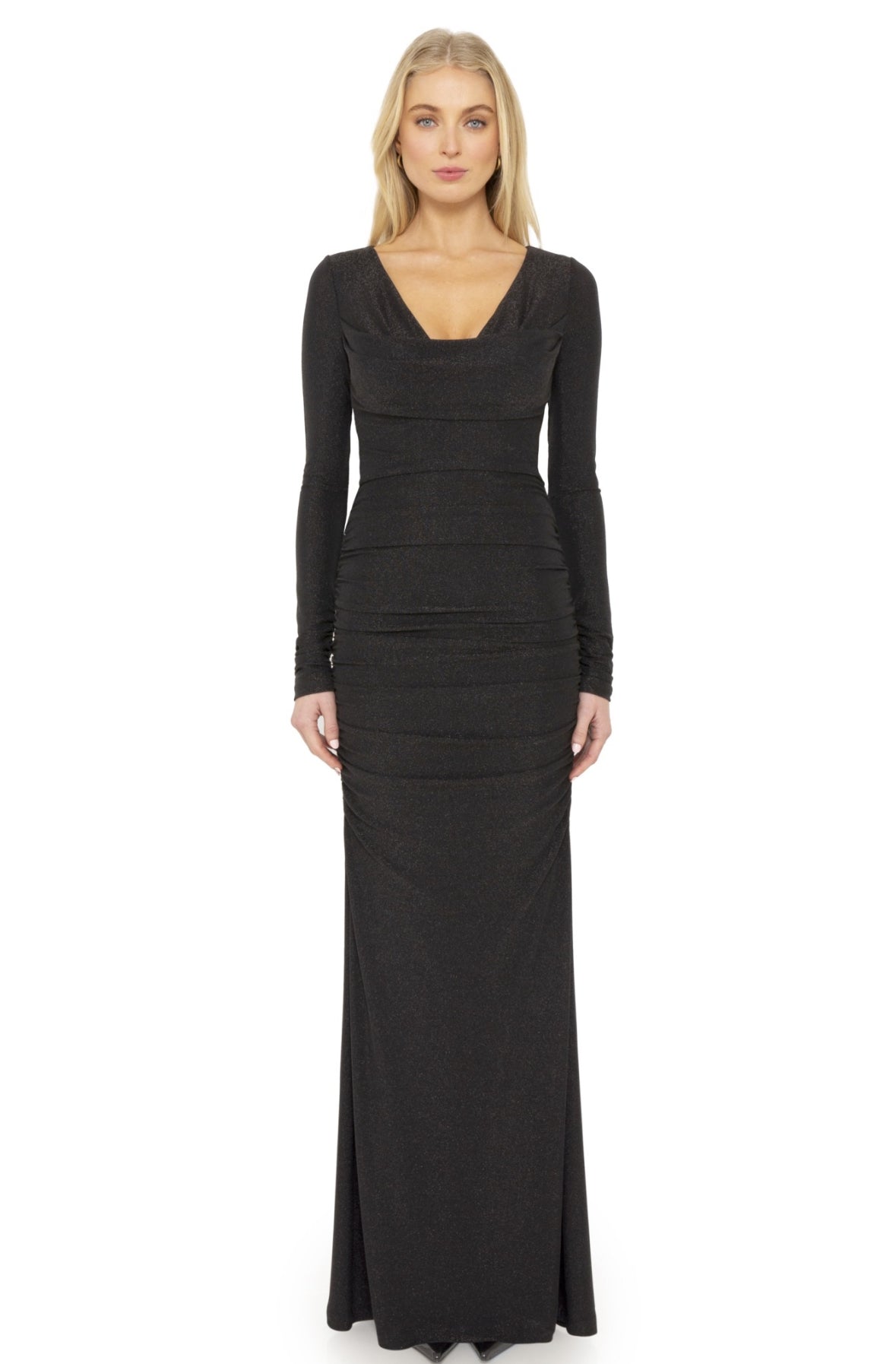The Rafaela Maxi Dress features a draped V-neckline that adds a touch of fluidity to the bodice. Made in a textured stretch lurex knit, thoughtfully placed tucks sculpt the waist, while shirring along the skirt enhances the silhouette, creating a flattering and elongating effect. Designed with long fitted sleeves and a streamlined floor-length hem, this gown offers a sleek yet refined appeal.