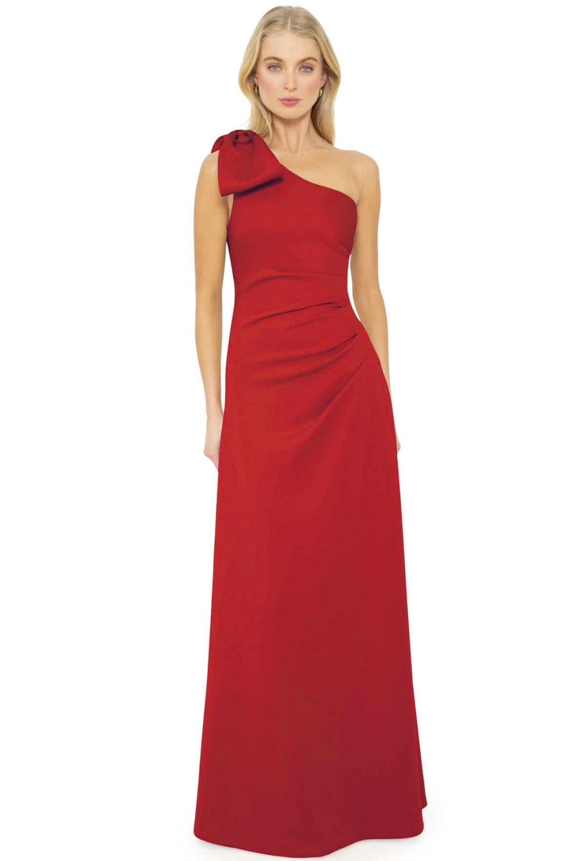 The Zyra Gown featuring a striking statement bow on the right shoulder for a bold yet refined touch. The sunburst tucks along the left side seam enhance the silhouette, creating a flattering, sculpted effect made in a stretch knit fabric and finished with a gracefully flared hem.