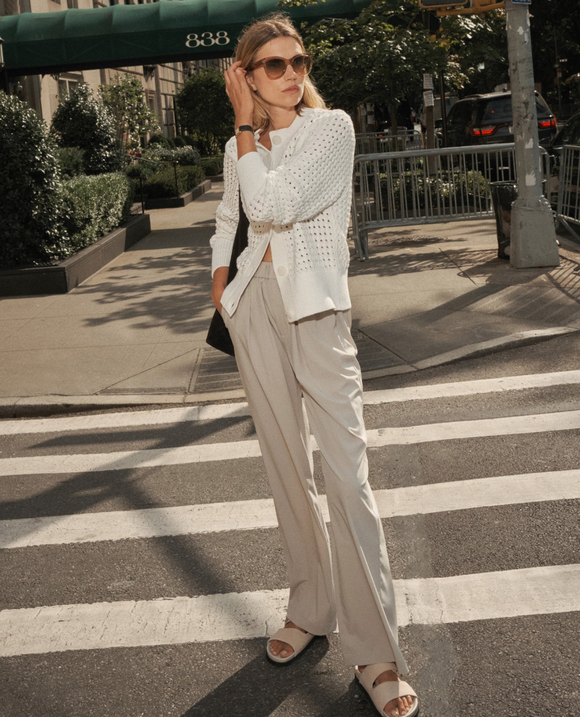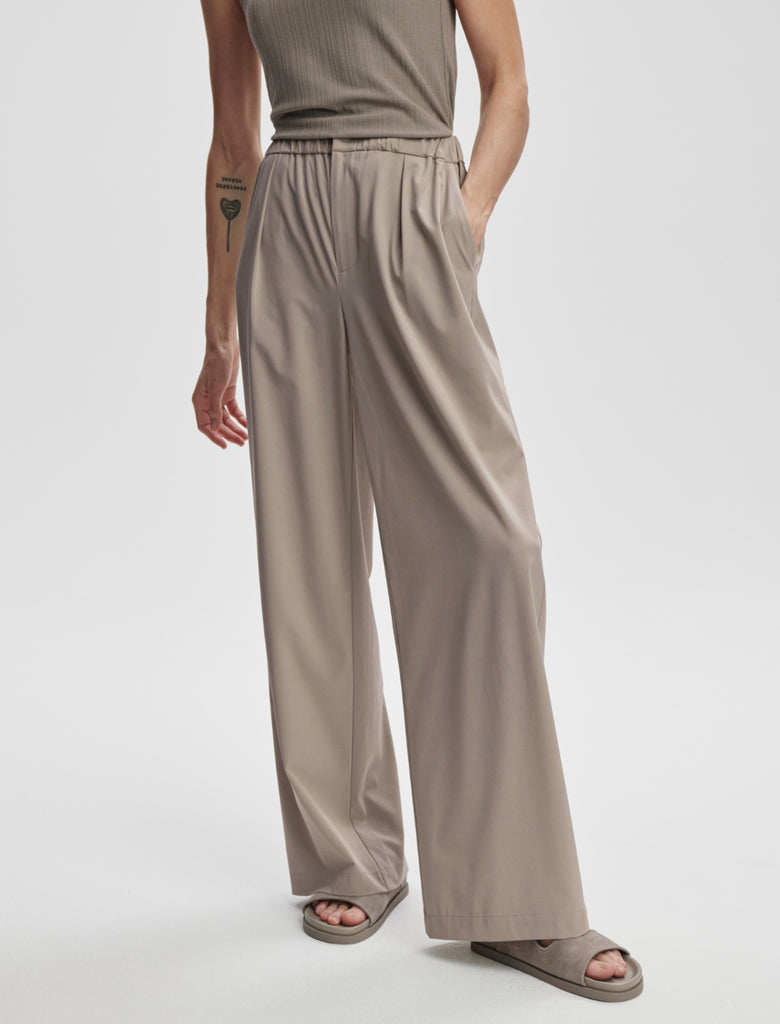 With their wide leg silhouette and central front pleating, the Kayson pants are a contemporary wardrobe staple. Lightweight and effortlessly versatile, they’re finished with a snap and zip fastening.