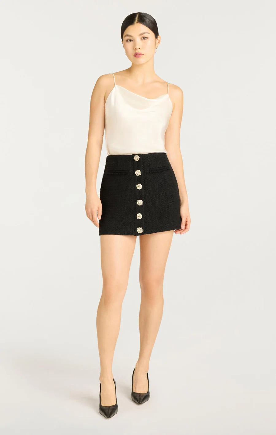 The Linda Skirt is a charming mini skirt adorned with shining gold buttons down the front, adding a touch of elegance. Perfectly crafted to complement the Linda Jacket, it offers a sophisticated silhouette ideal for stylish, polished looks.