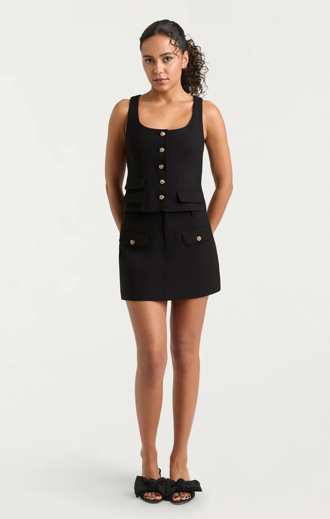 The Lovina Skirt is a chic mini-length piece made from a comfortable polyester blend. Featuring front pocket detailing and a mid-waist fit, it pairs effortlessly with its matching top for a coordinated, stylish look that balances casual and contemporary elegance.