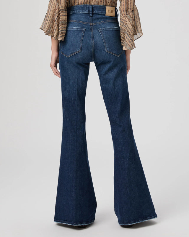 Marlow is the widest flare in the PAIGE collection. This elevated style grazes over the knee, creating a long and lean look that effortlessly elongates the legs. In a rich dark wash with subtle thigh sanding, vintage-inspired details, and a 32" inseam, this pair is crafted from heritage-inspired denim with a soft hand-feel and a hint of stretch.