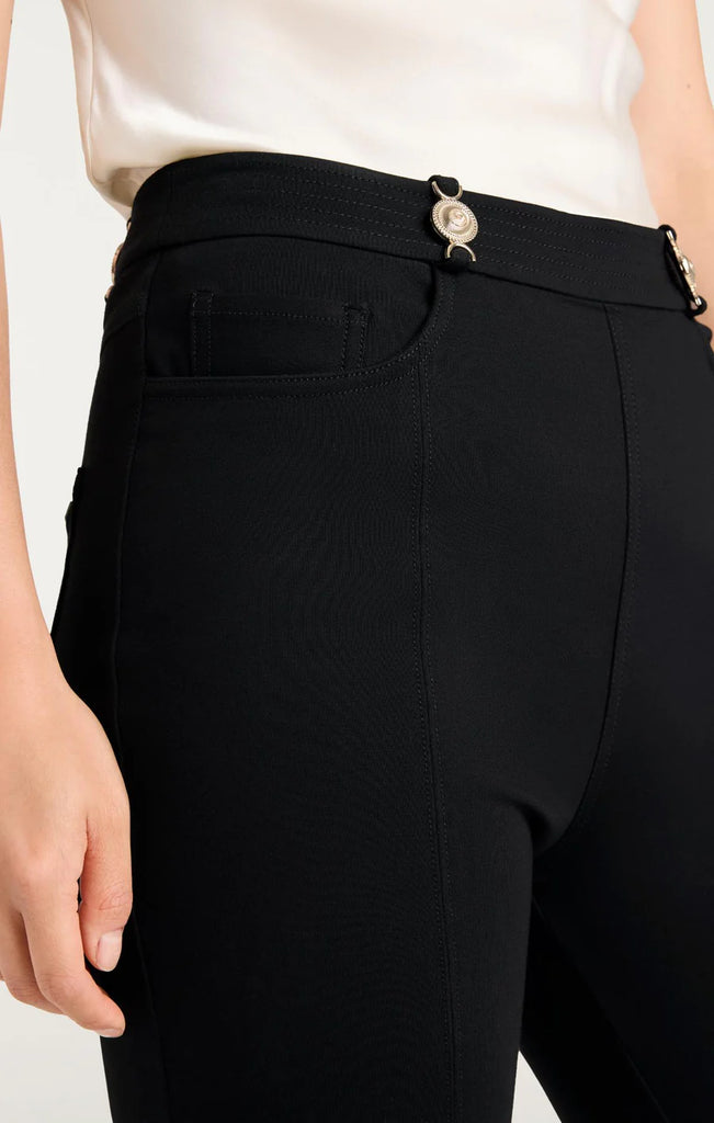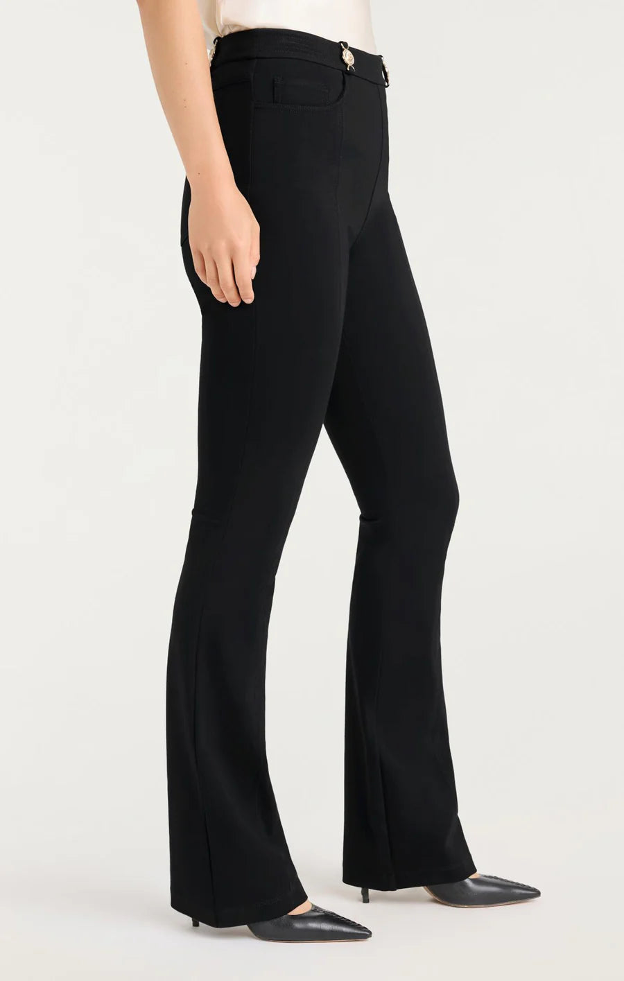 The Ponte Devin Pant features a sleek, black fitted design that hugs the silhouette, complemented by flared bottoms for a balanced, tailored look. The waistband is detailed with gold embellishments, adding a touch of luxury to this sophisticated wardrobe staple.