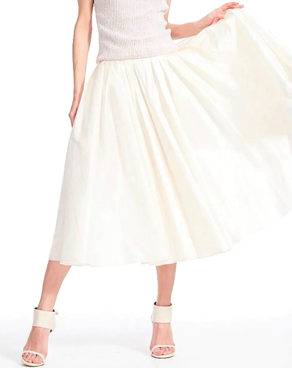 Dramatic Midi Tea length skirt in gorgeous taffeta take our tops to the next level of glam! Perfect color match for the monochromatic look or mix and match. Side seam pockets. Made in India.