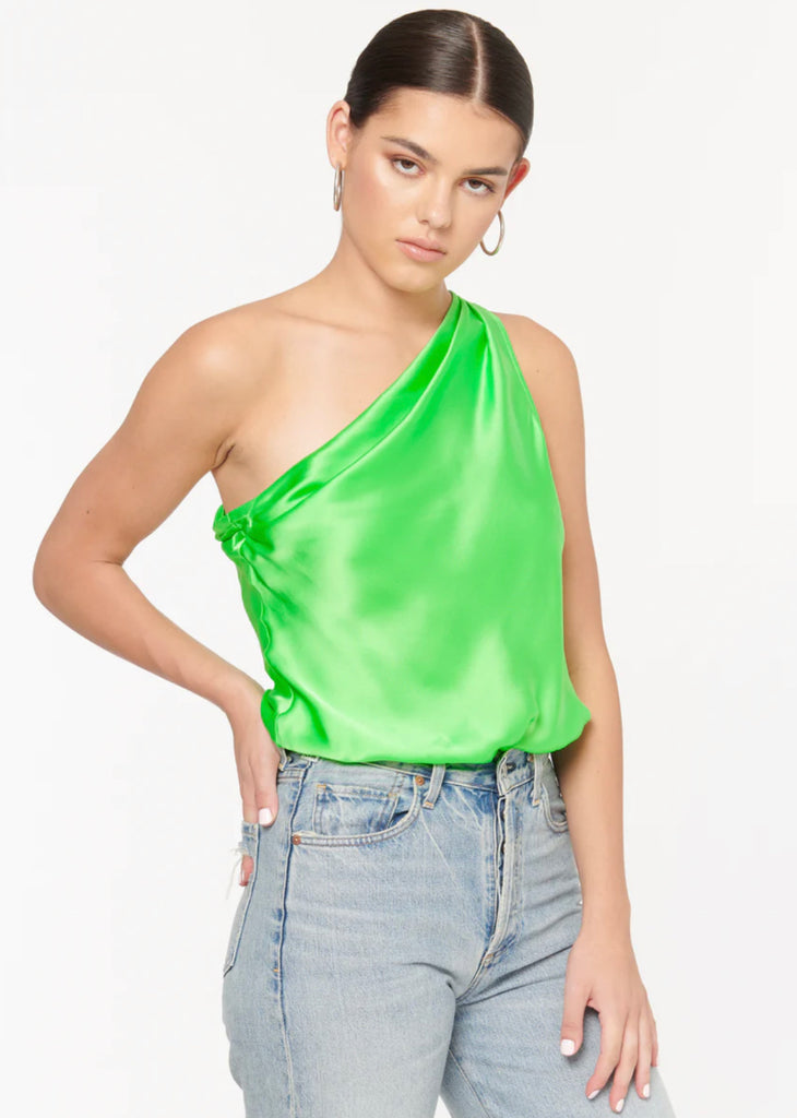 Constructed with silk sandwash charmeuse, the Darby Bodysuit is a comfortable and effortless fit. The asymmetrical draped neckline adds a sophisticated touch to a one-shoulder style. The Darby will be your wardrobe builder of the season.