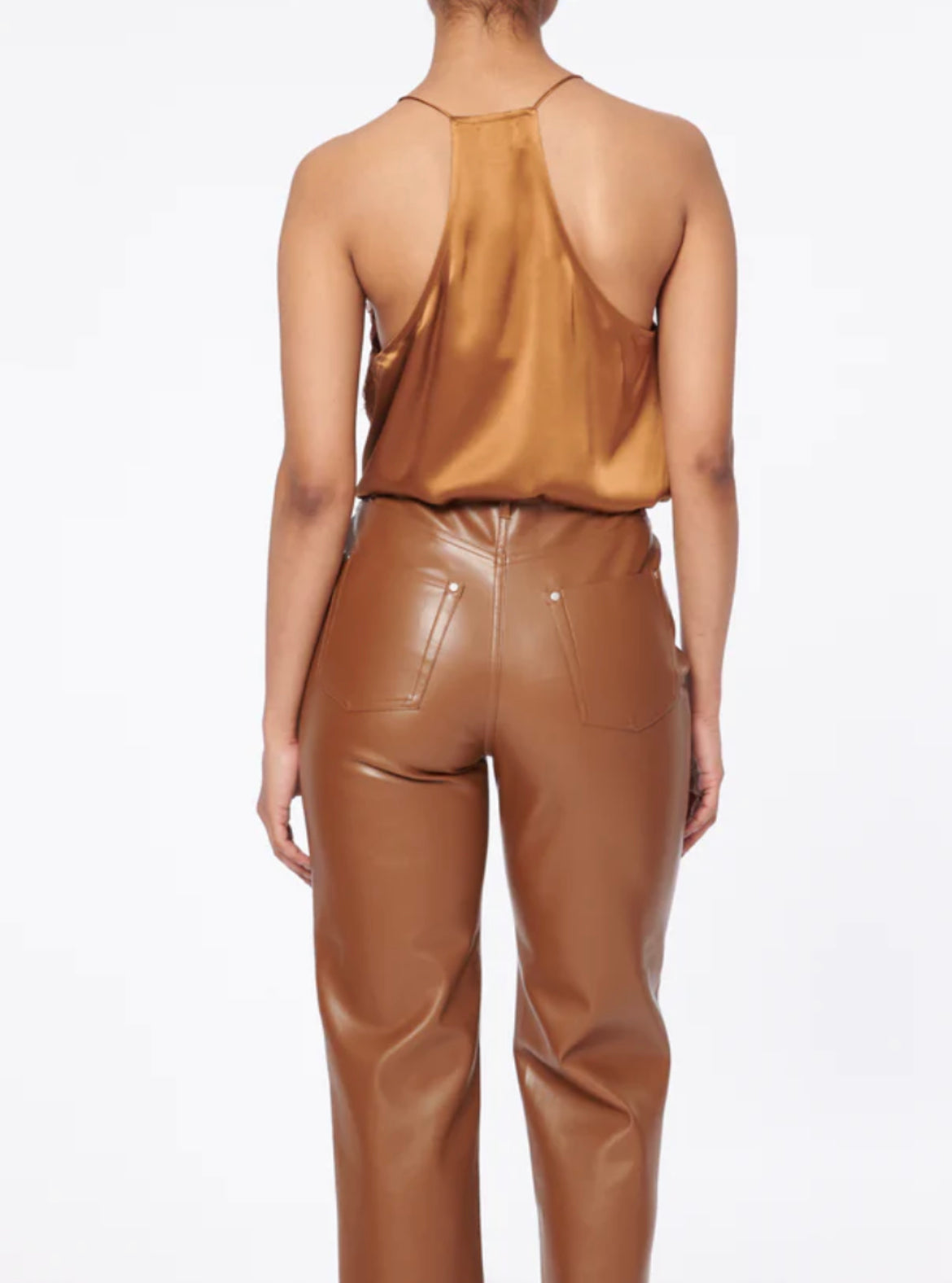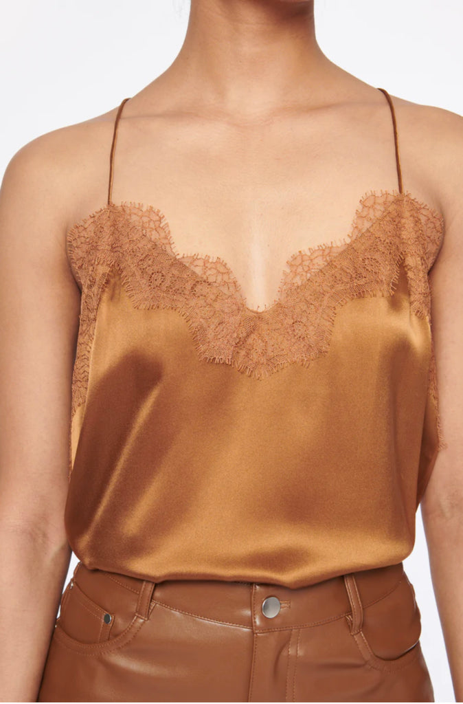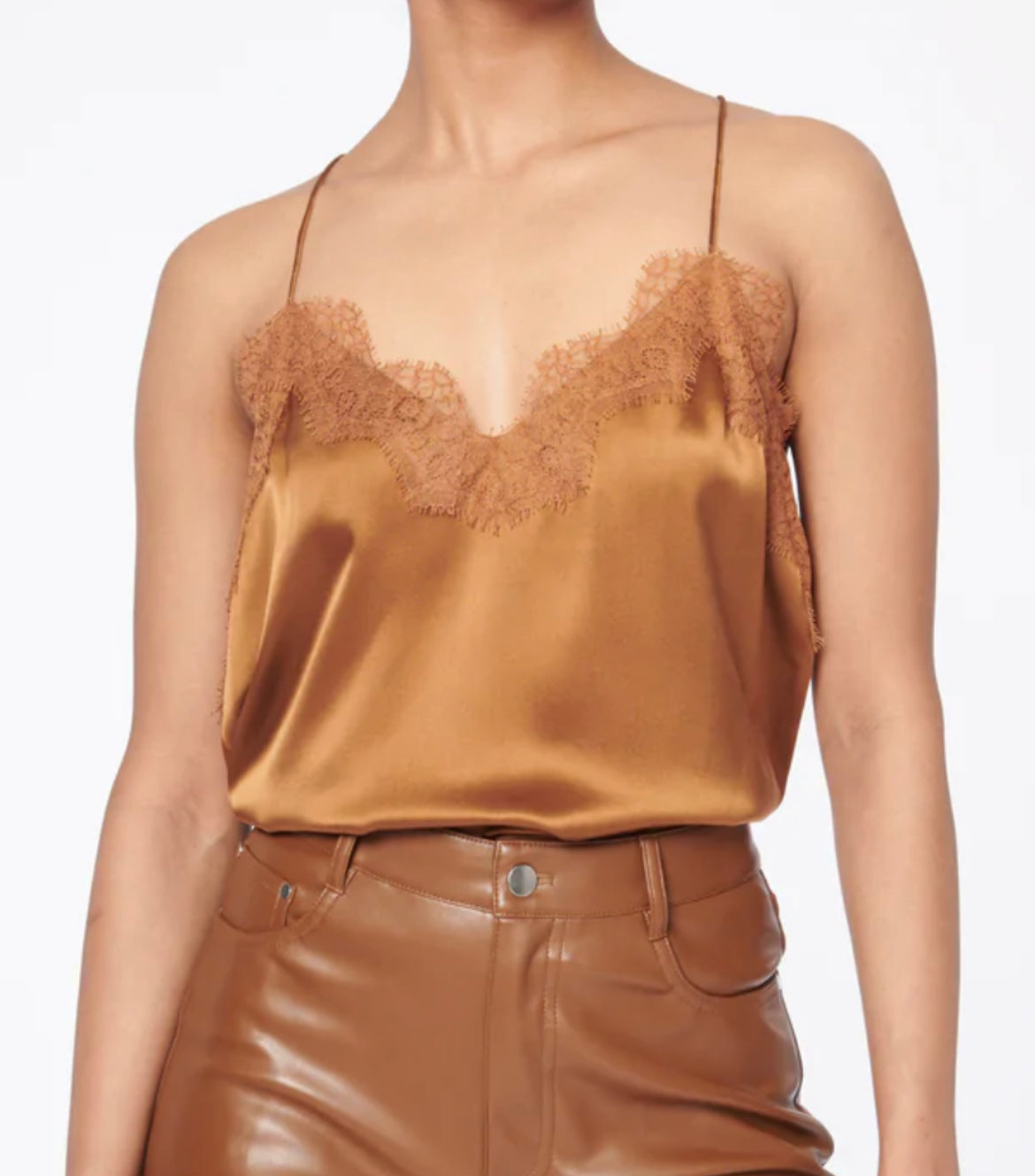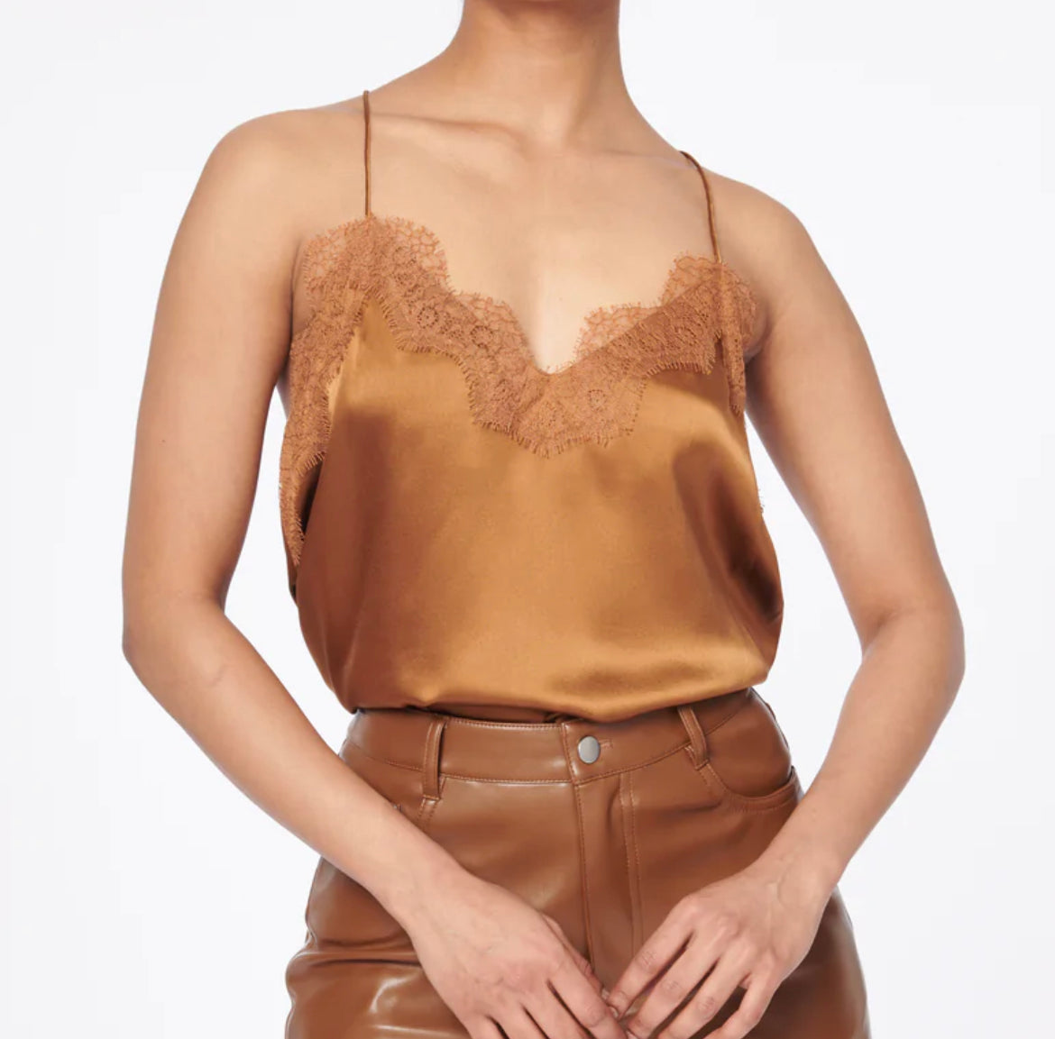 Our brand favorite Racer Charmeuse Cami is crafted in a silk sandwash charmeuse and features a V-neckline with delicate and feminine French lace trimming. This light-weight camisole style has a racer back construction and a relaxed fitting bodice. The perfect day to night wardrobe builder. Now available in Toffee, a golden caramel brown hue.