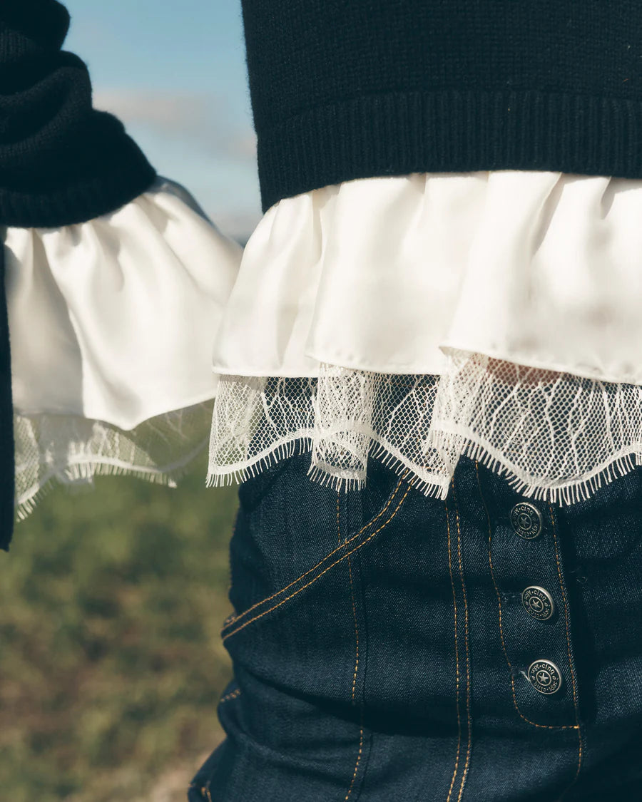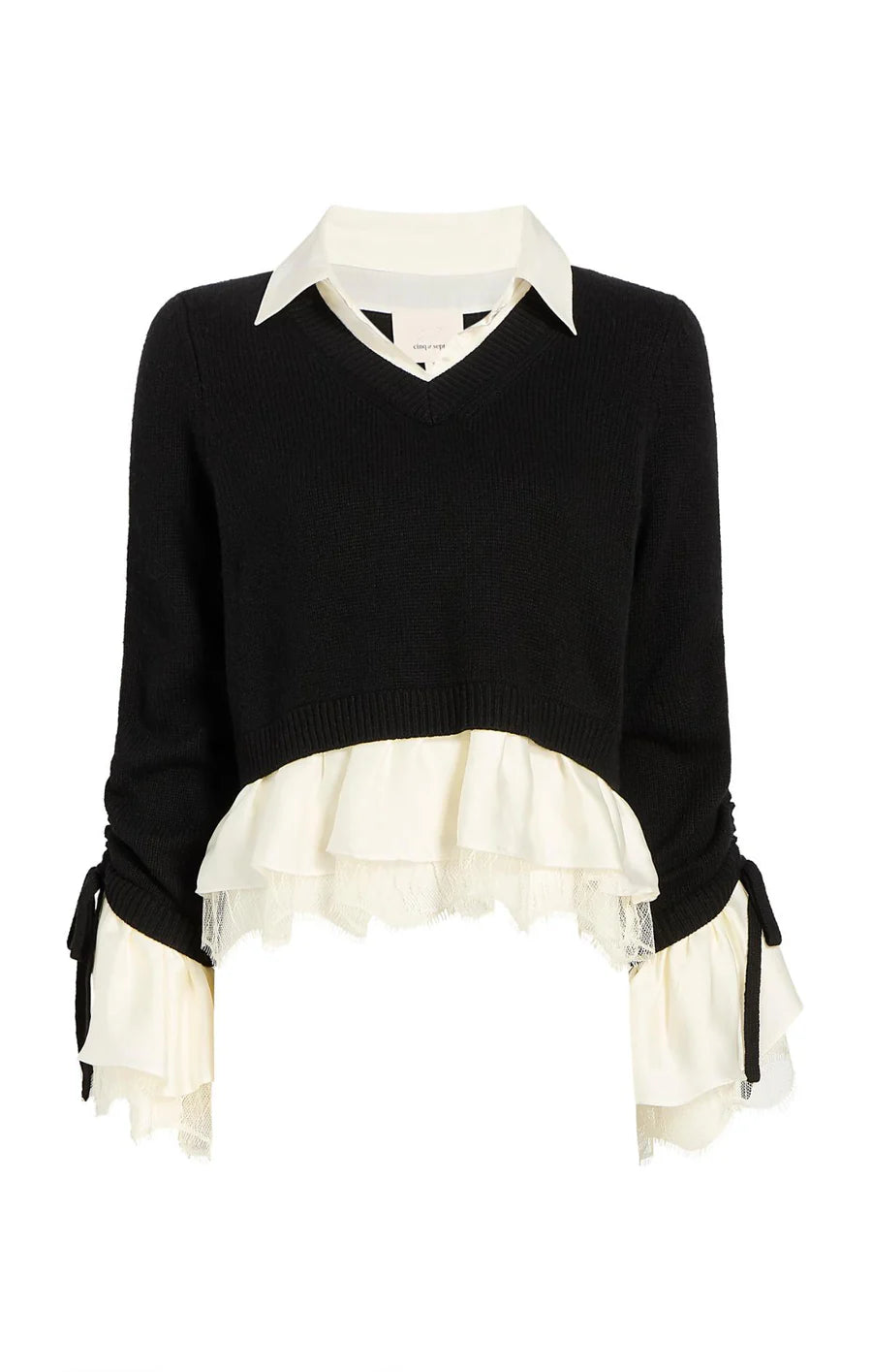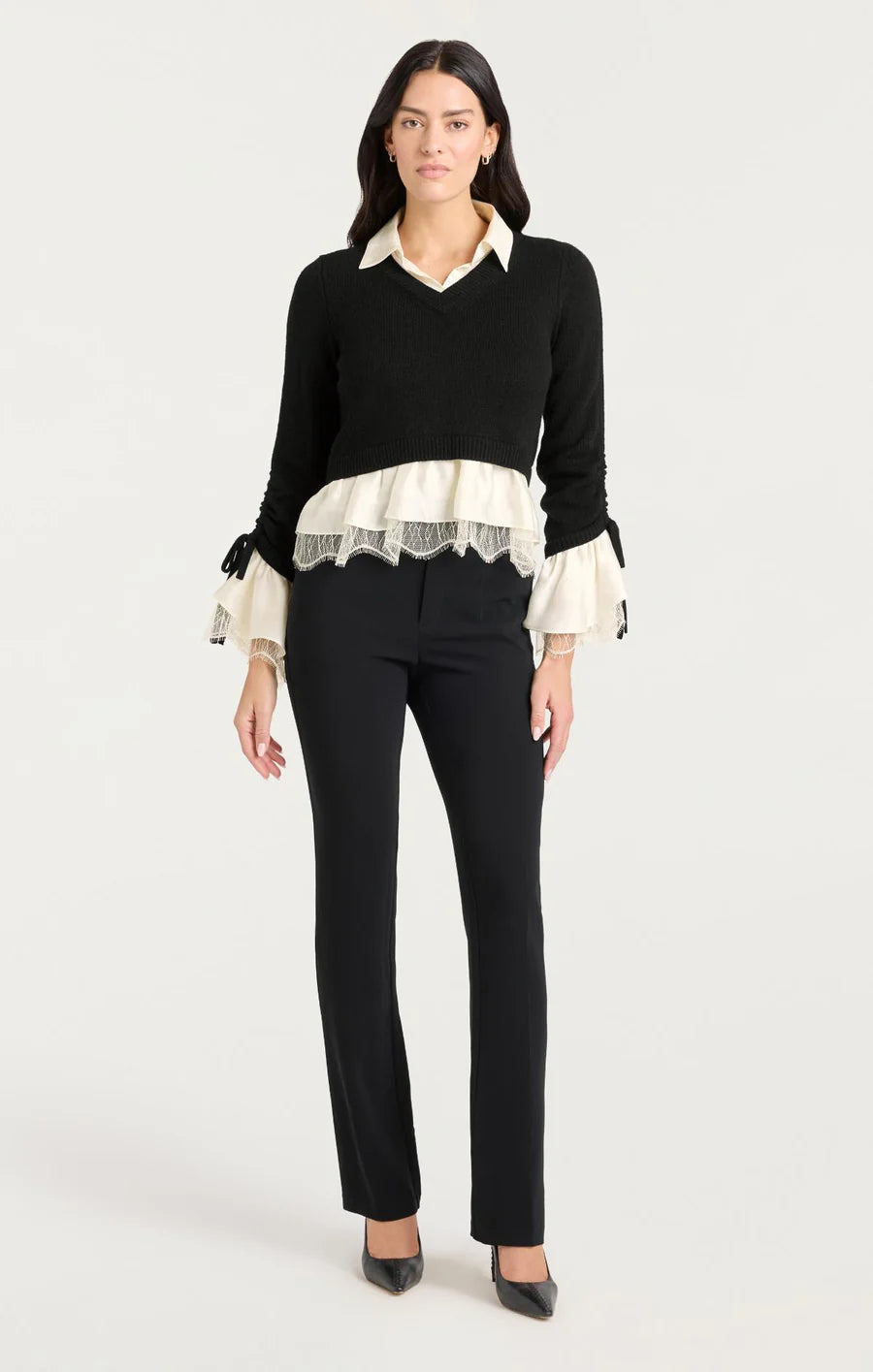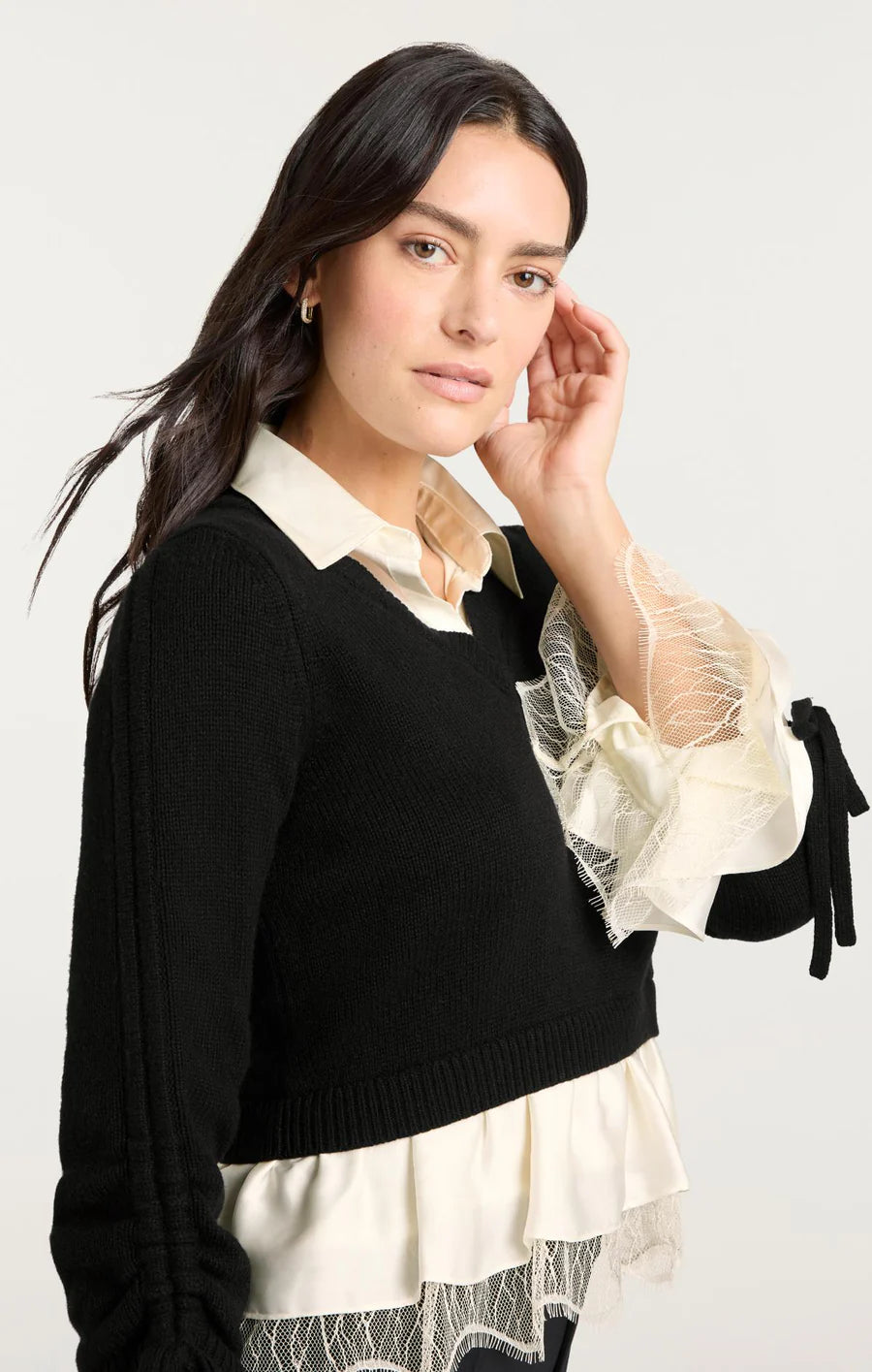 The Milla Pullover features a pre-styled look that adds a romantic, feminine touch to your wardrobe. Its flowy ruffle lace hem and cinch tie details at the sleeve ends create a flattering silhouette, blending elegance with comfortable style for a graceful layered look.