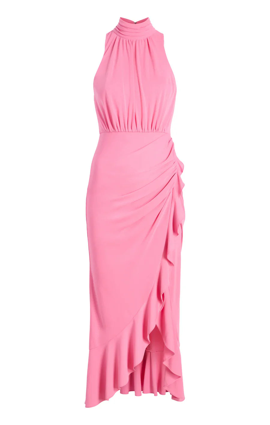 Introducing the elegant Antonia Dress. With a high neck and sleeveless design, this dress exudes confidence and sophistication. The cascading ruffle adds a touch of femininity, while the faux wrap skirt silhouette flatters your figure. Made from luxurious matte jersey material, this midi length dress is perfect for any special occasion.