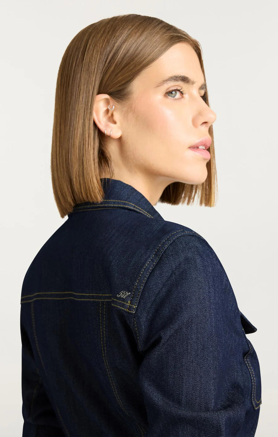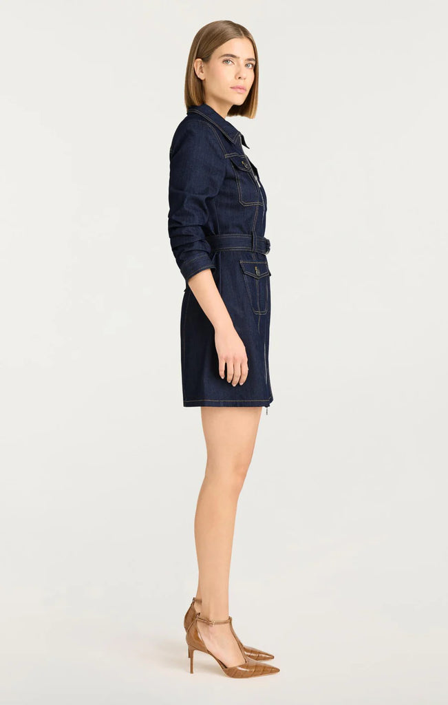 The Fauna Dress is a sophisticated denim mini dress featuring a zip-up front and a classic collar. Its scrunched sleeves add subtle texture, while the belted waist accentuates a flattering silhouette. Perfect for elevating your casual wardrobe with effortless style.