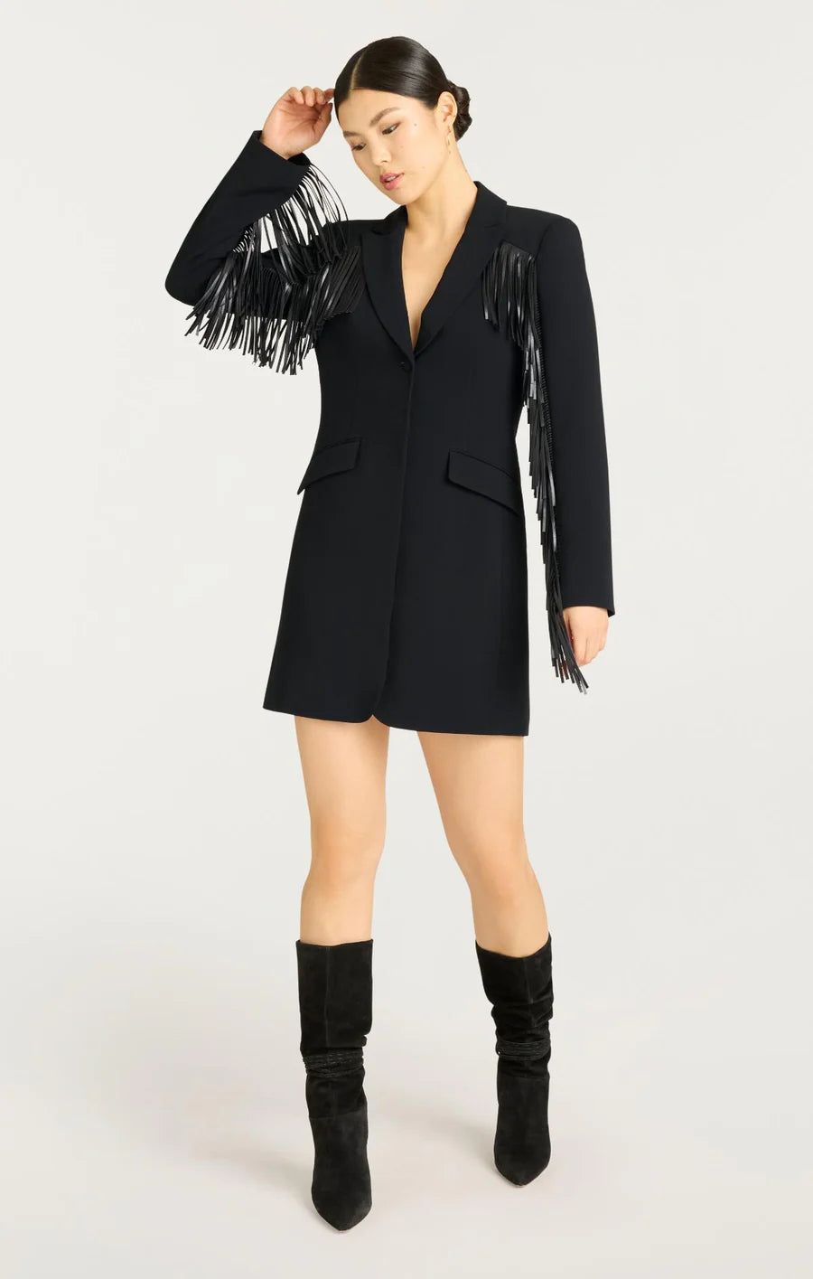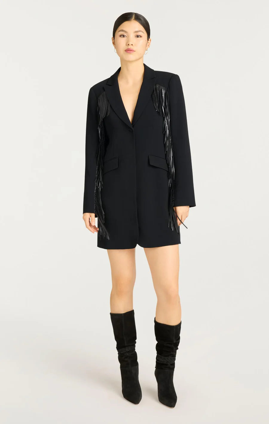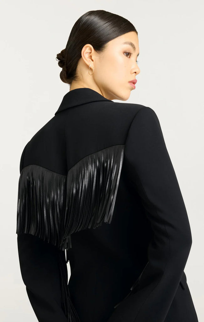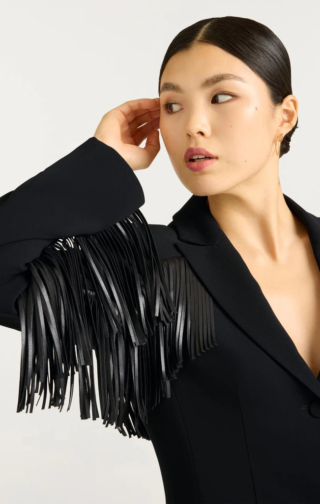 The Fringe Joelette Dress is a chic black blazer dress adorned with fringe detailing on the arms, chest, and back. With its sleek silhouette and refined accents, just throw on a black boot or heel for an effortless and stylish look.