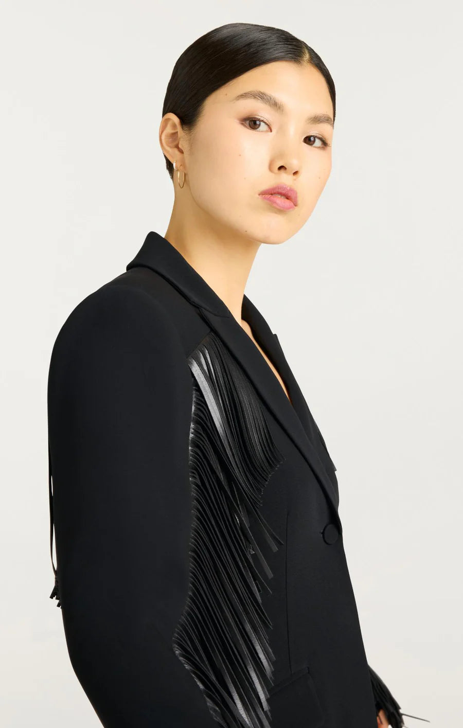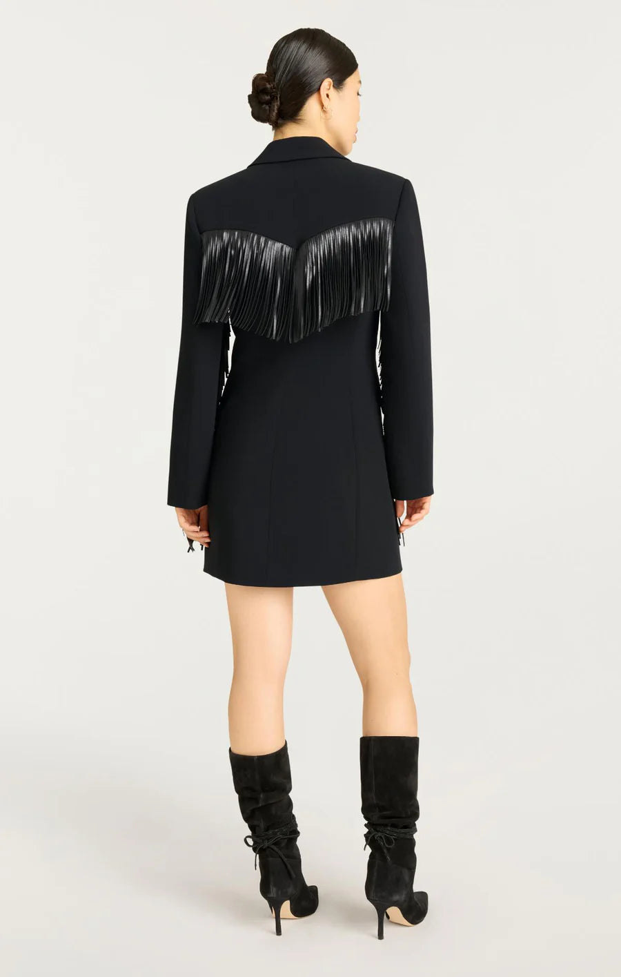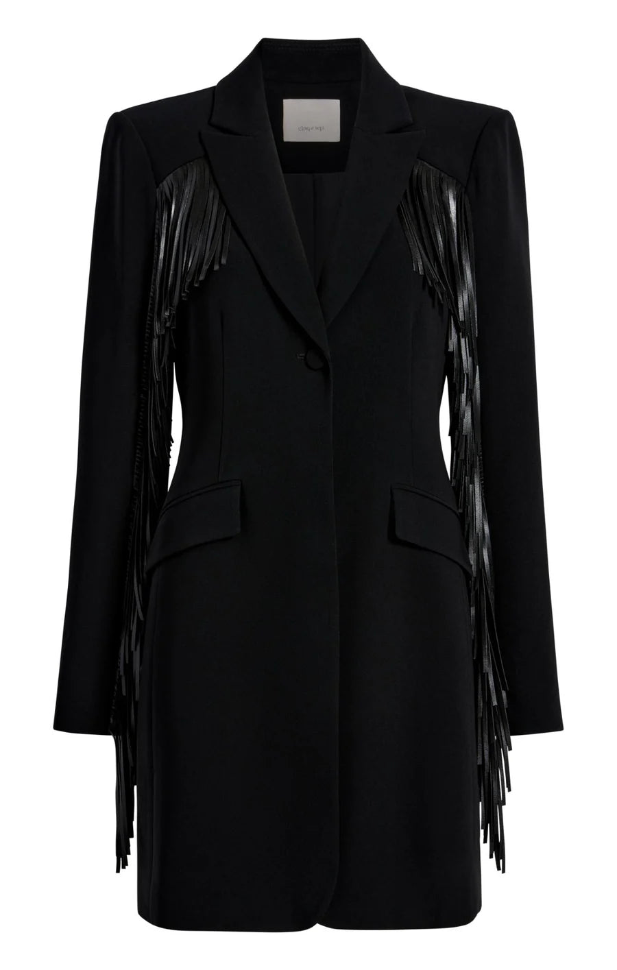 The Fringe Joelette Dress is a chic black blazer dress adorned with fringe detailing on the arms, chest, and back. With its sleek silhouette and refined accents, just throw on a black boot or heel for an effortless and stylish look.