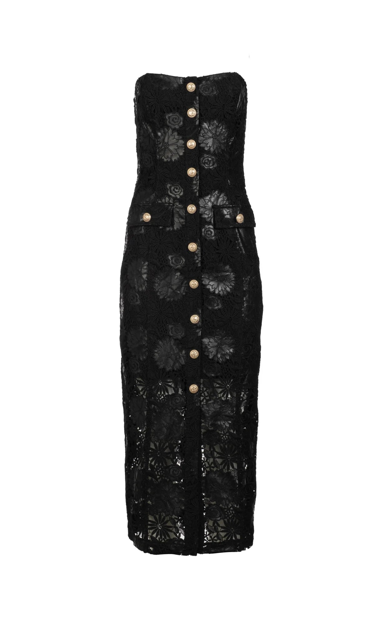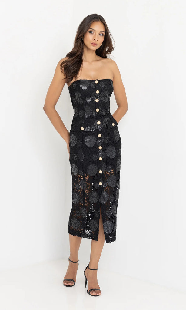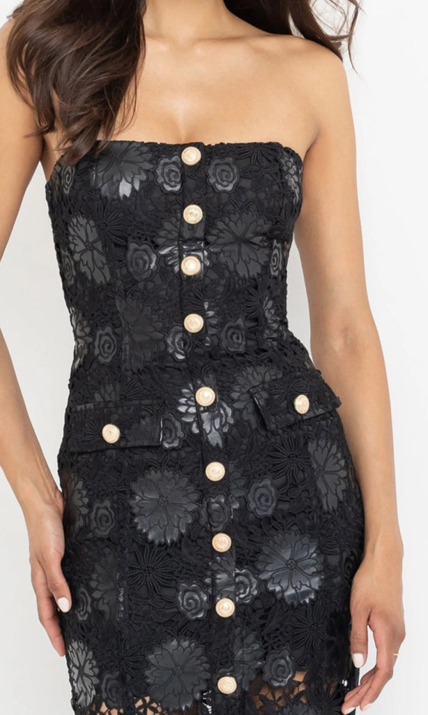 Sleek vegan leather and floral Guipure lace intertwine in a striking contrast of edge and elegance, finished with gold buttons for a refined touch. A bold addition to your fall wardrobe, this statement-making midi dress turns heads with every wear.