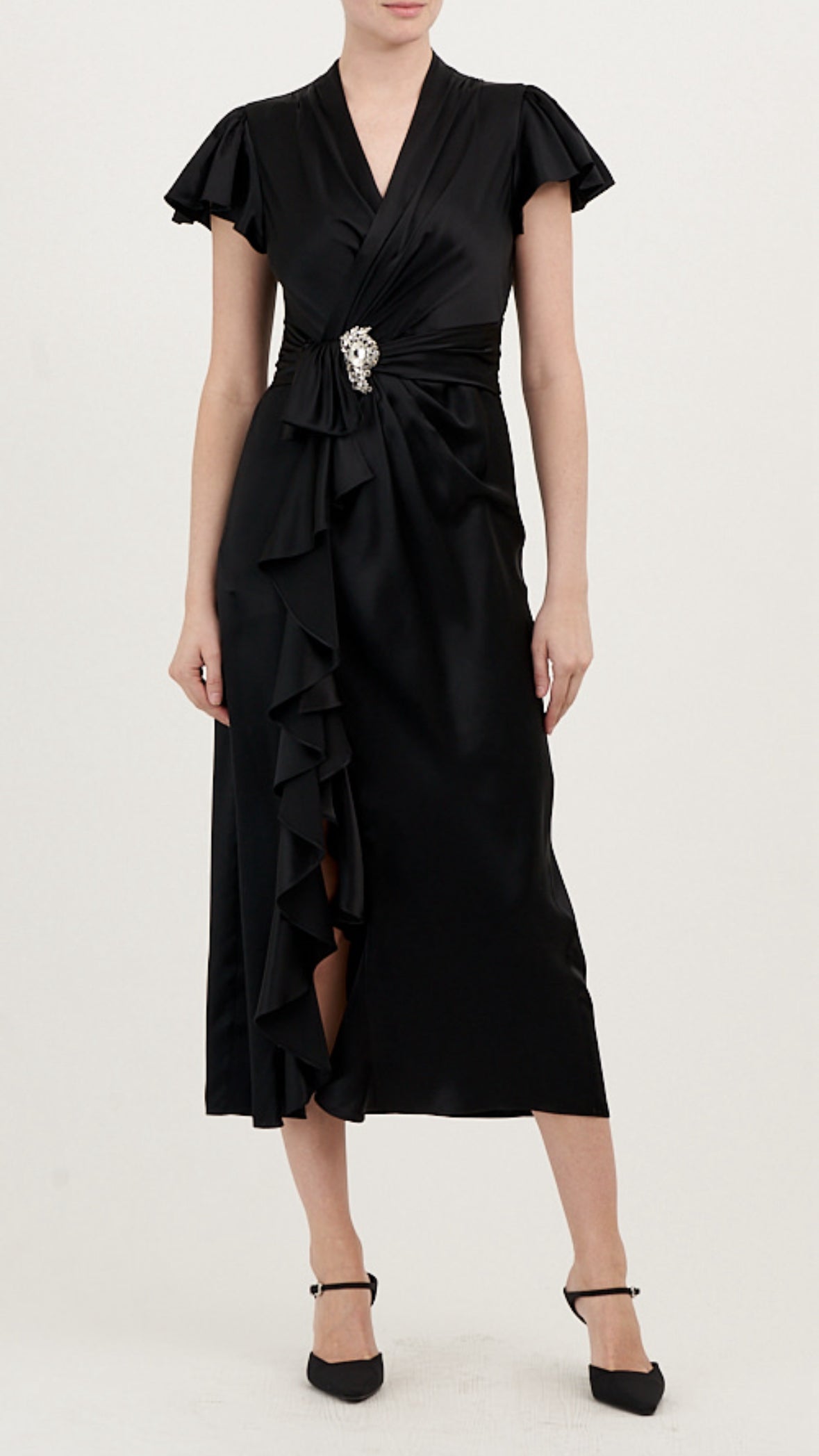 Crafted of radiant silk, Cinq à Sept’s Oscar midi dress is designed with a wrap waist, an embellished buckle, and a cascading draped ruffle down the front.