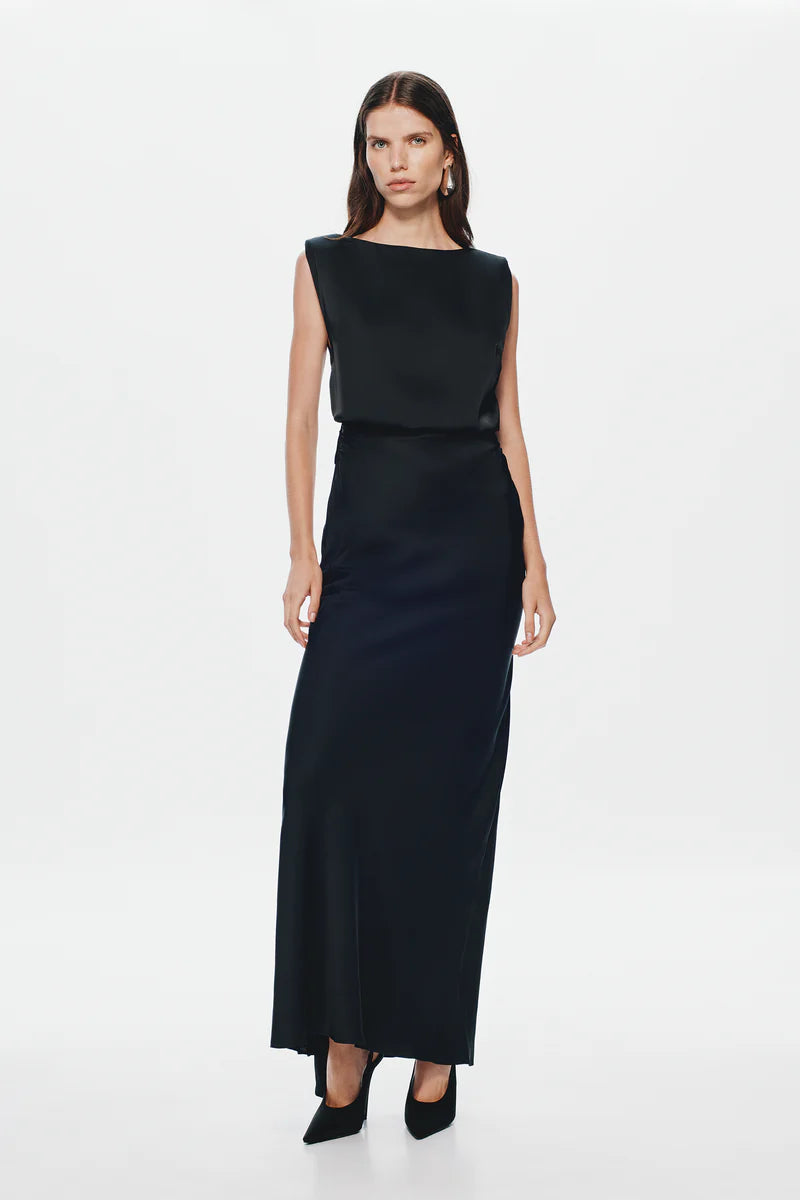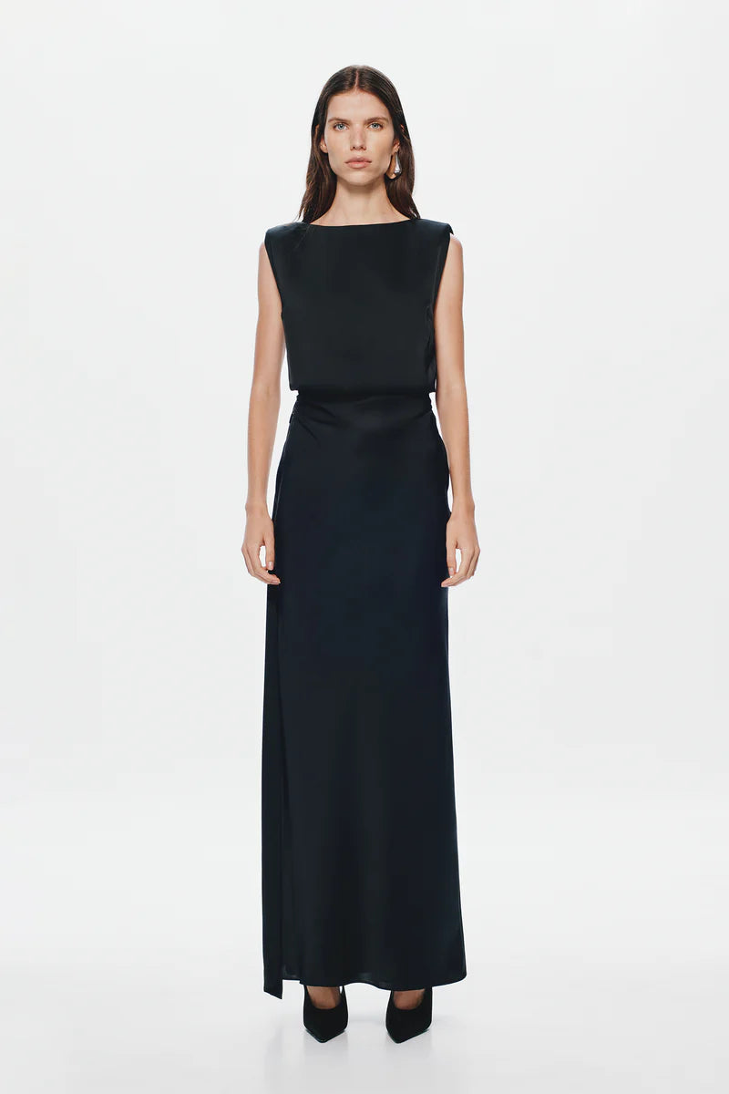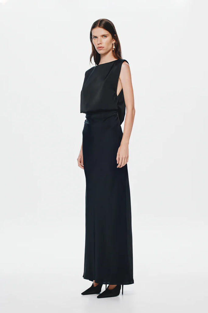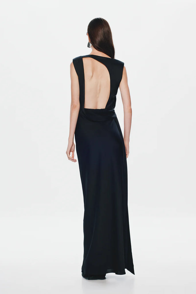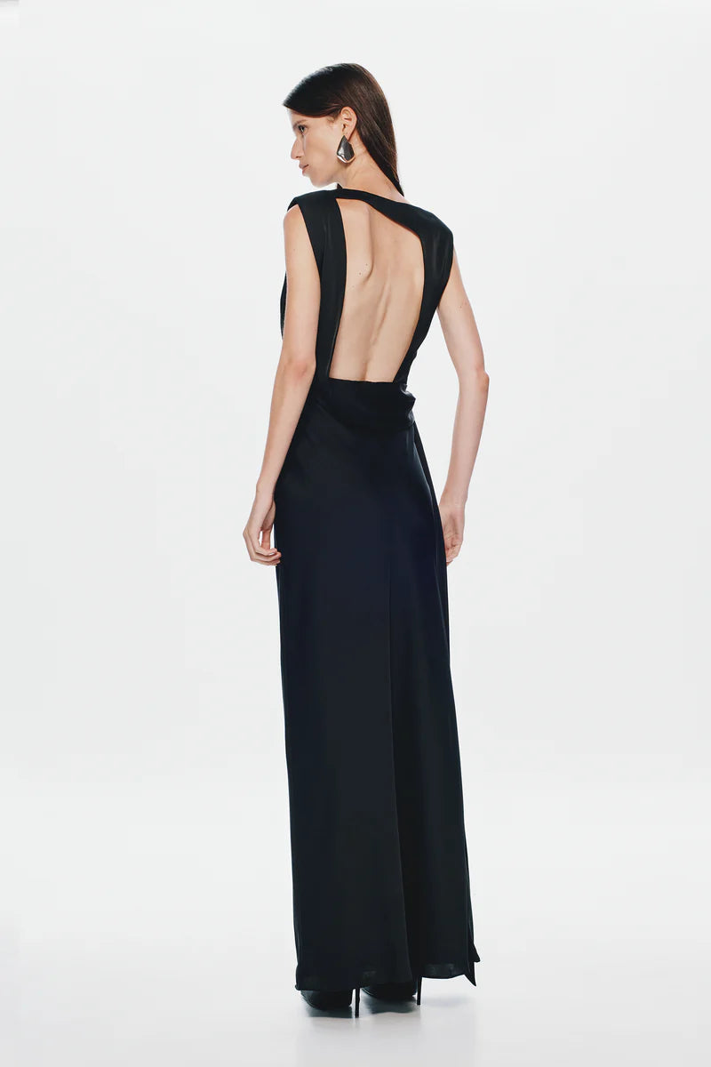 A structured silhouette that shares a high neckline and exposed back. Blouson in style, the dress accentuates the waistline creating a refined look.