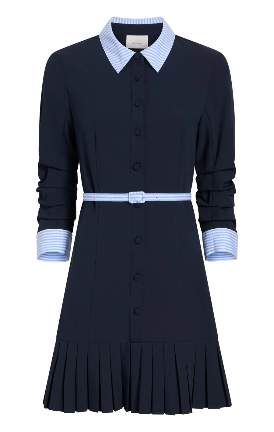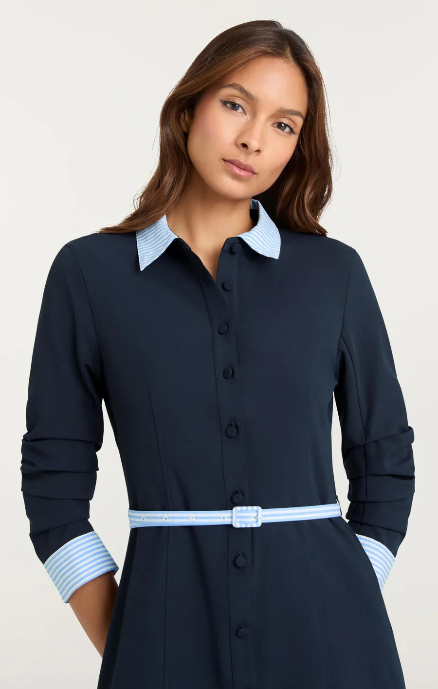 Introducing the Stripe Shirting Lucilla Dress, a refined piece that balances classic tailoring with modern sensibility. Eye-catching contrast stripes frame the collar and cuffs, while a cinched skinny belt highlights your silhouette. The pleated skirt offers graceful volume, complemented by scrunched three-quarter sleeves for contemporary appeal.