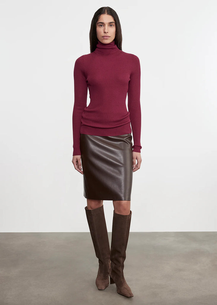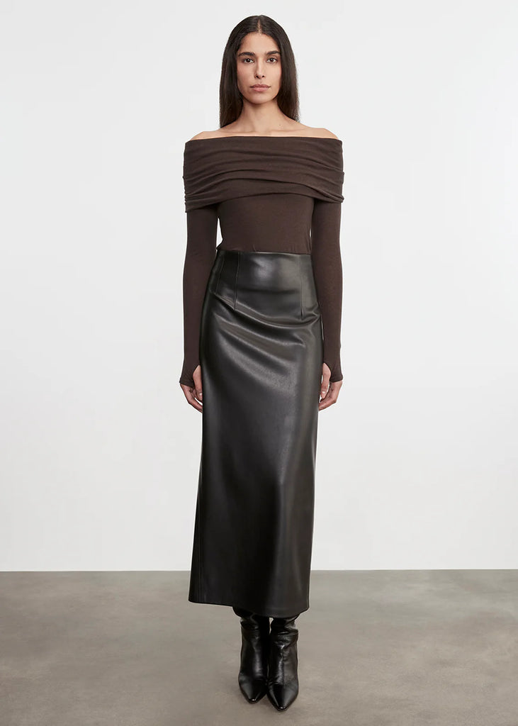 Leather Hi-Waist Curve Skirt in Dark Brown