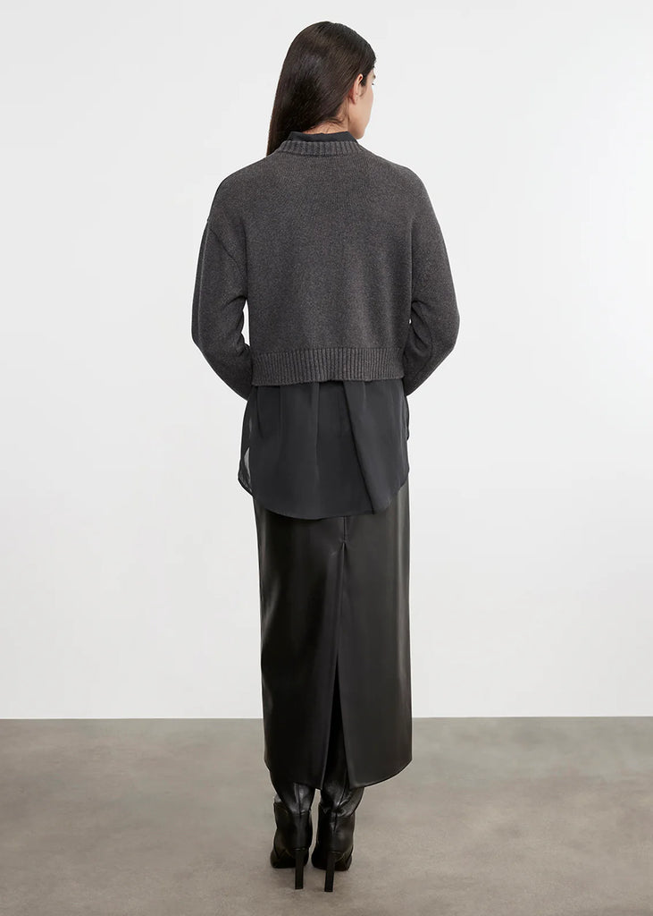A soft stretch vegan leather skirt with a high waist and dart shaping. Features a slim fit, high slit, and concealed back zip.