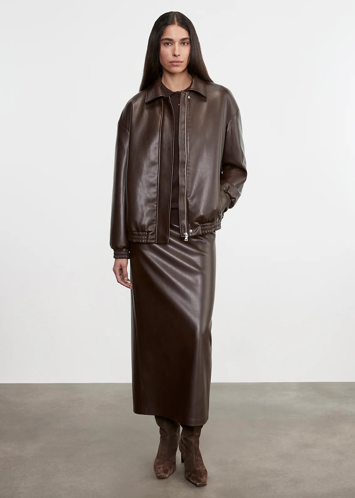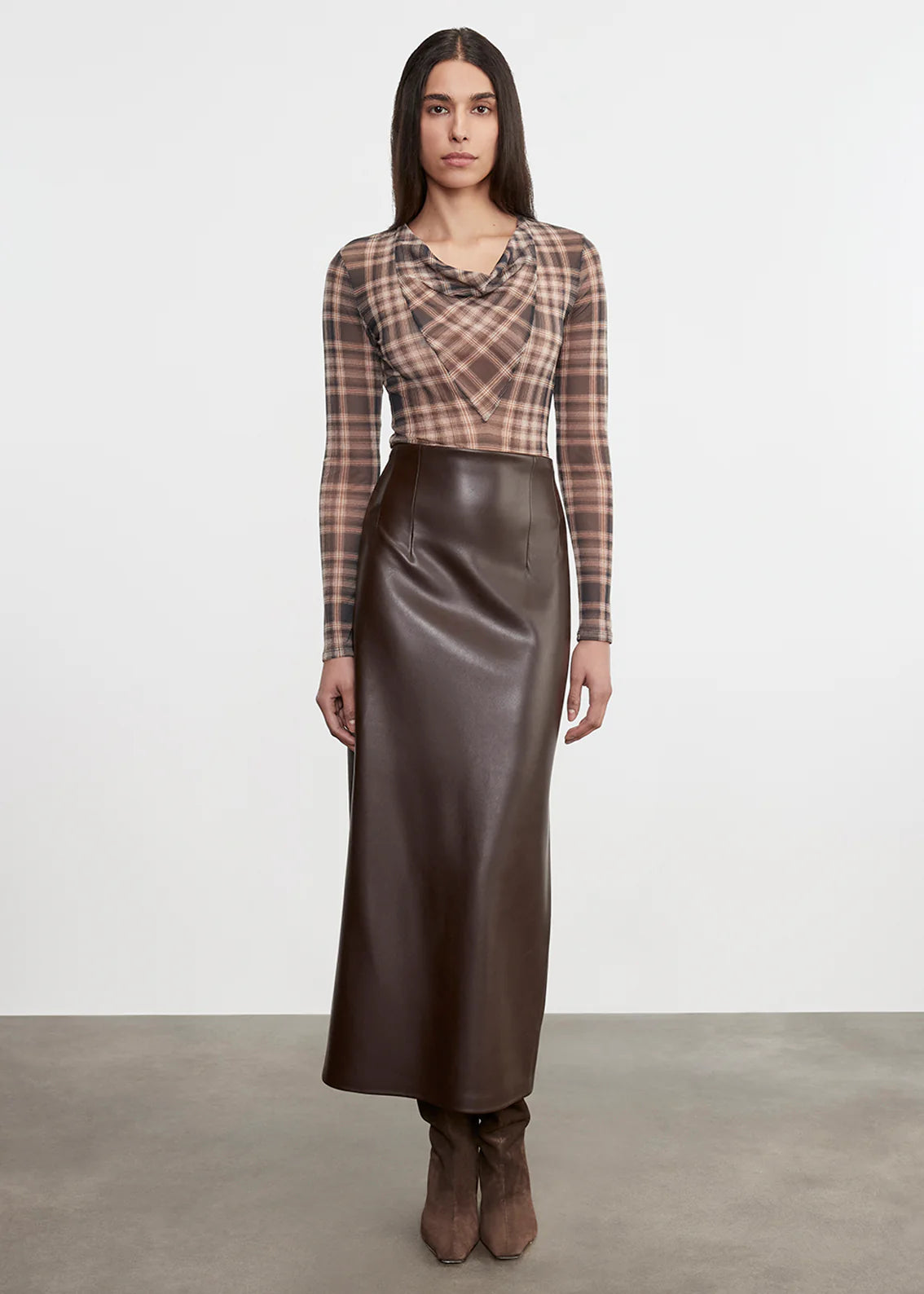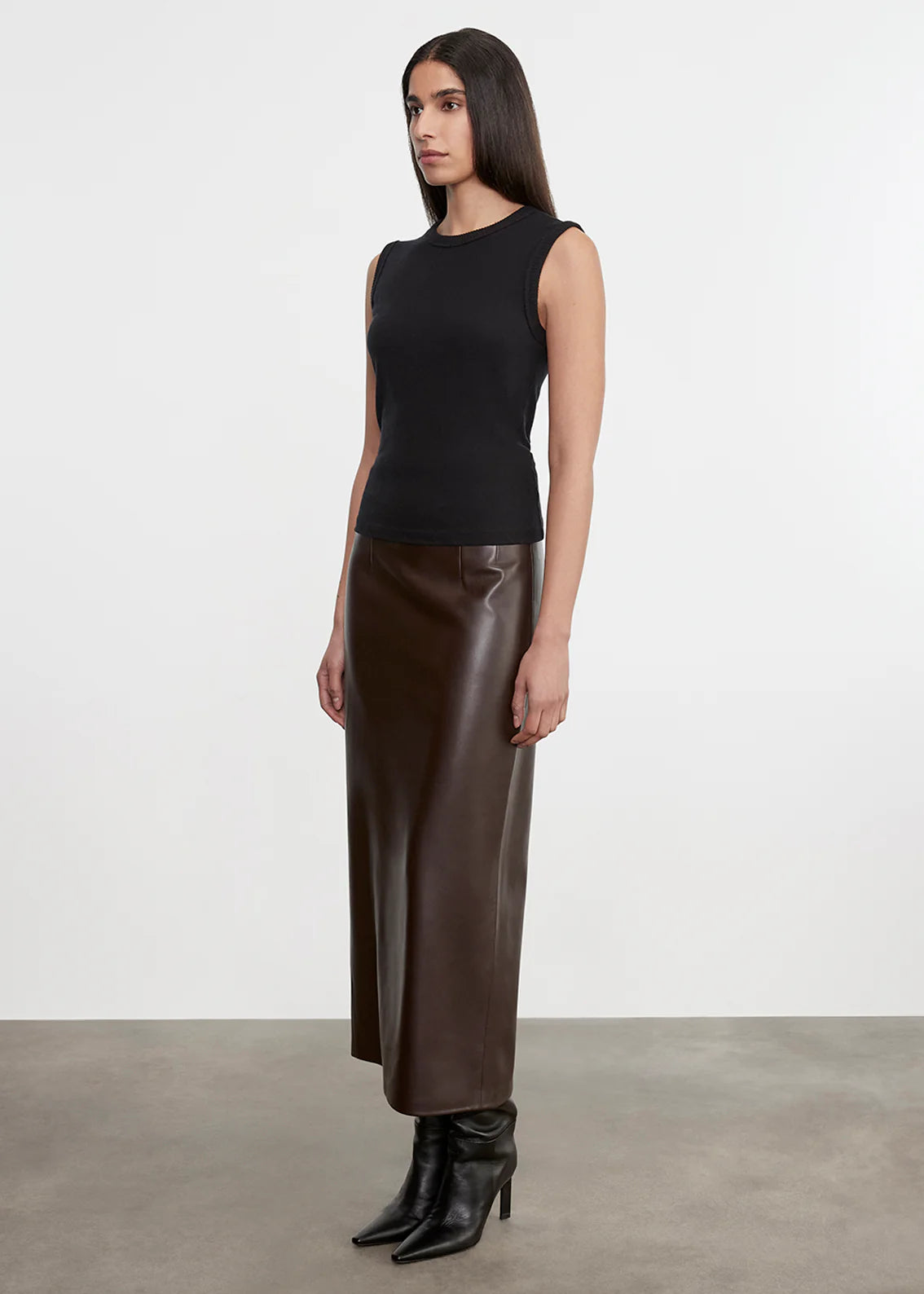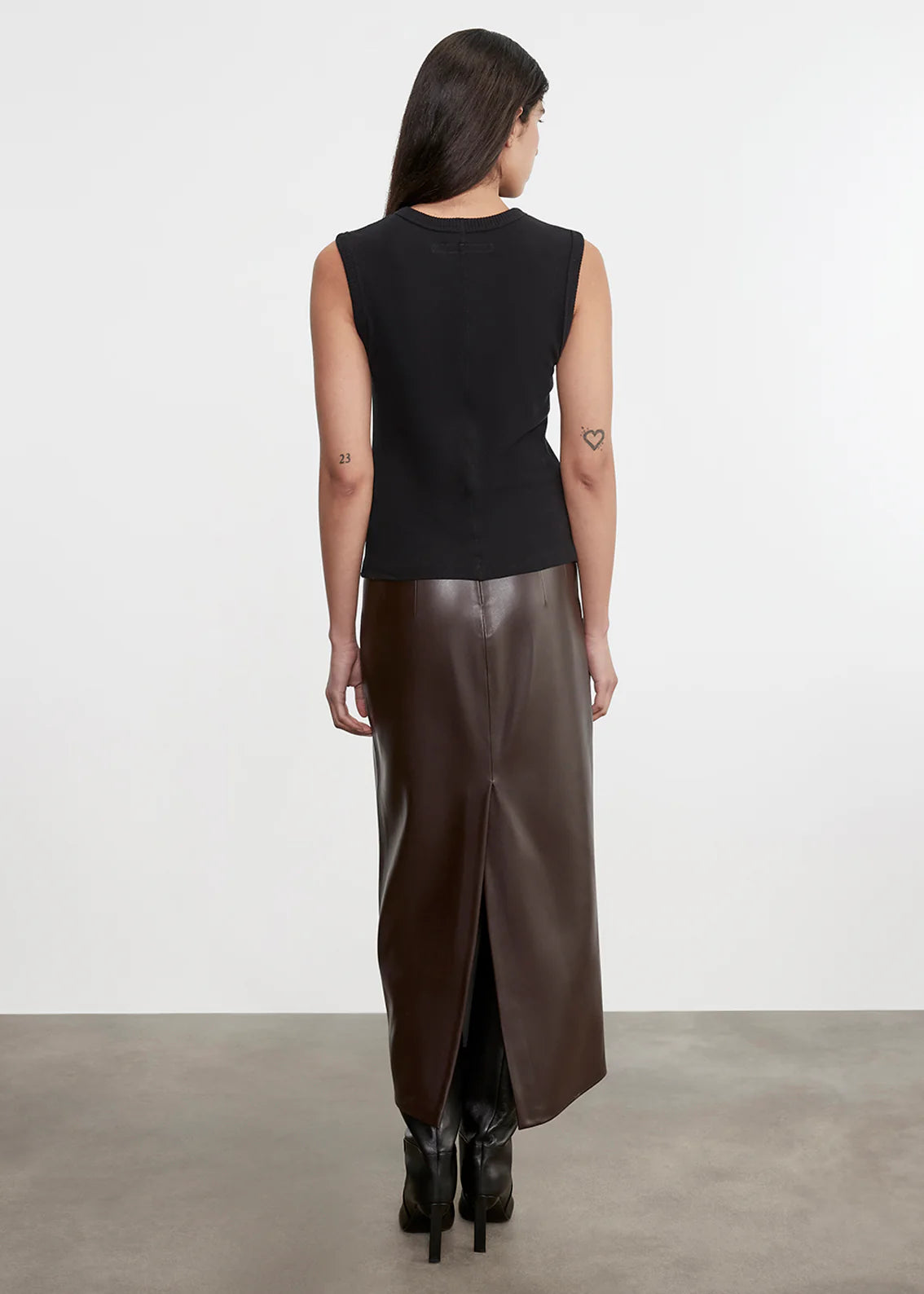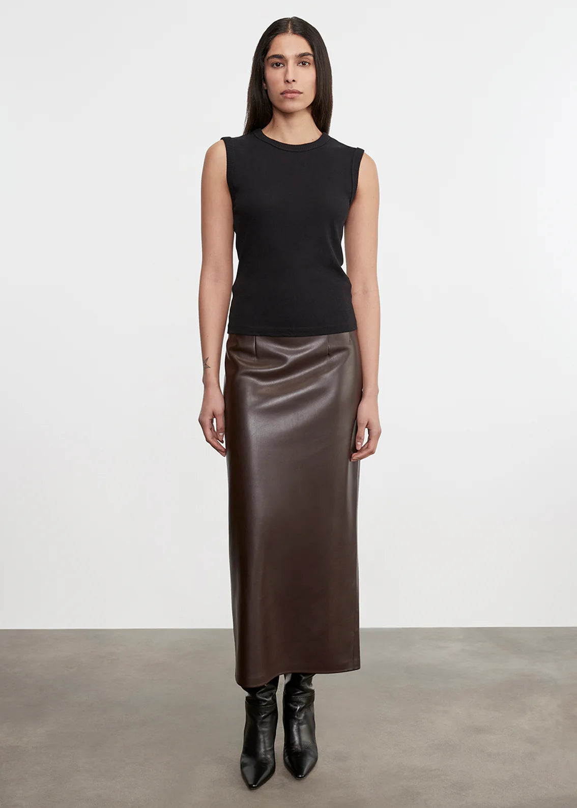 A soft stretch vegan leather skirt with a high waist and dart shaping. Features a slim fit, high slit, and concealed back zip.