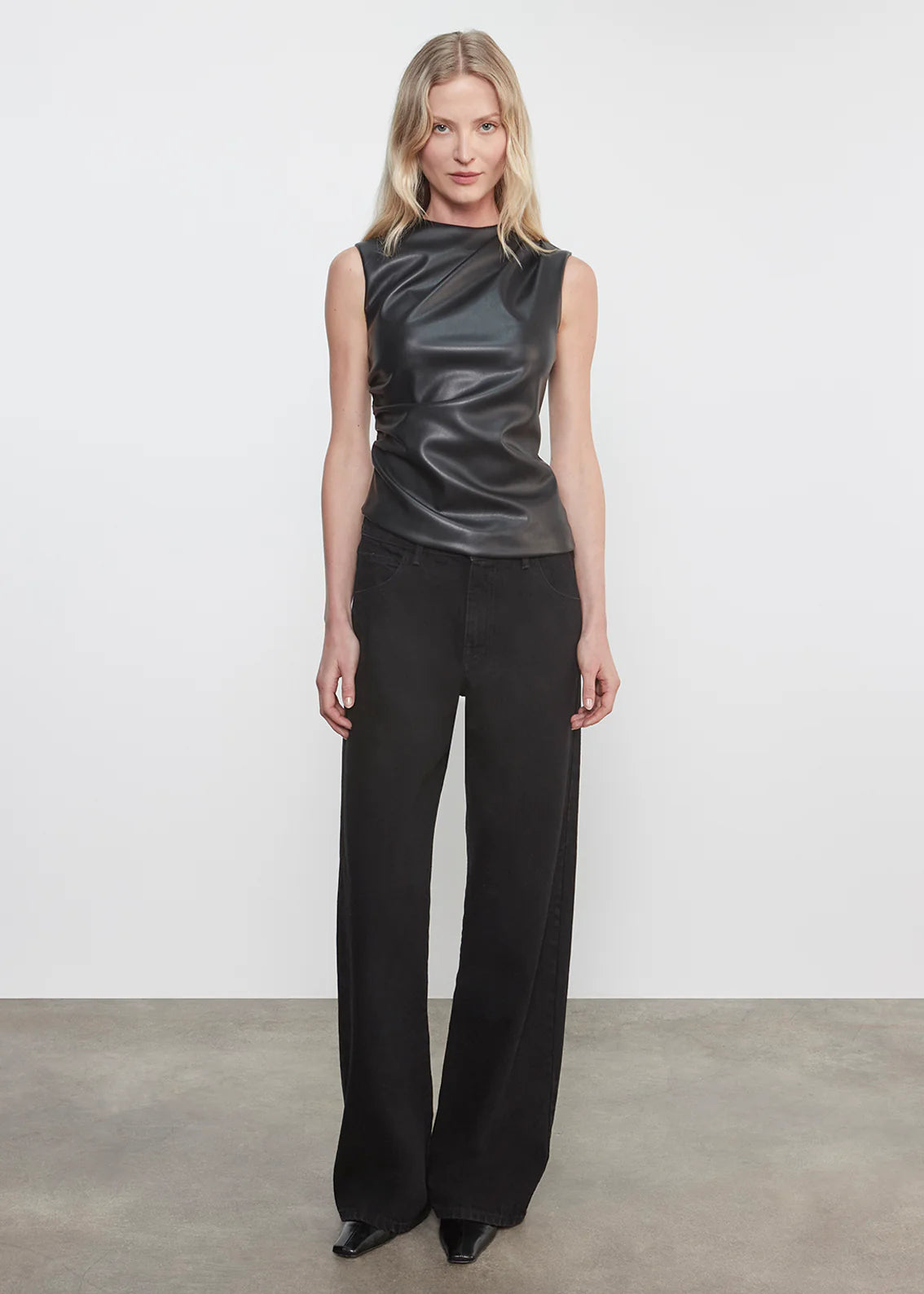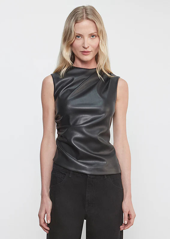 Sleeveless top in vegan leather with asymmetric ruche detail. High neckline and clean back seam.