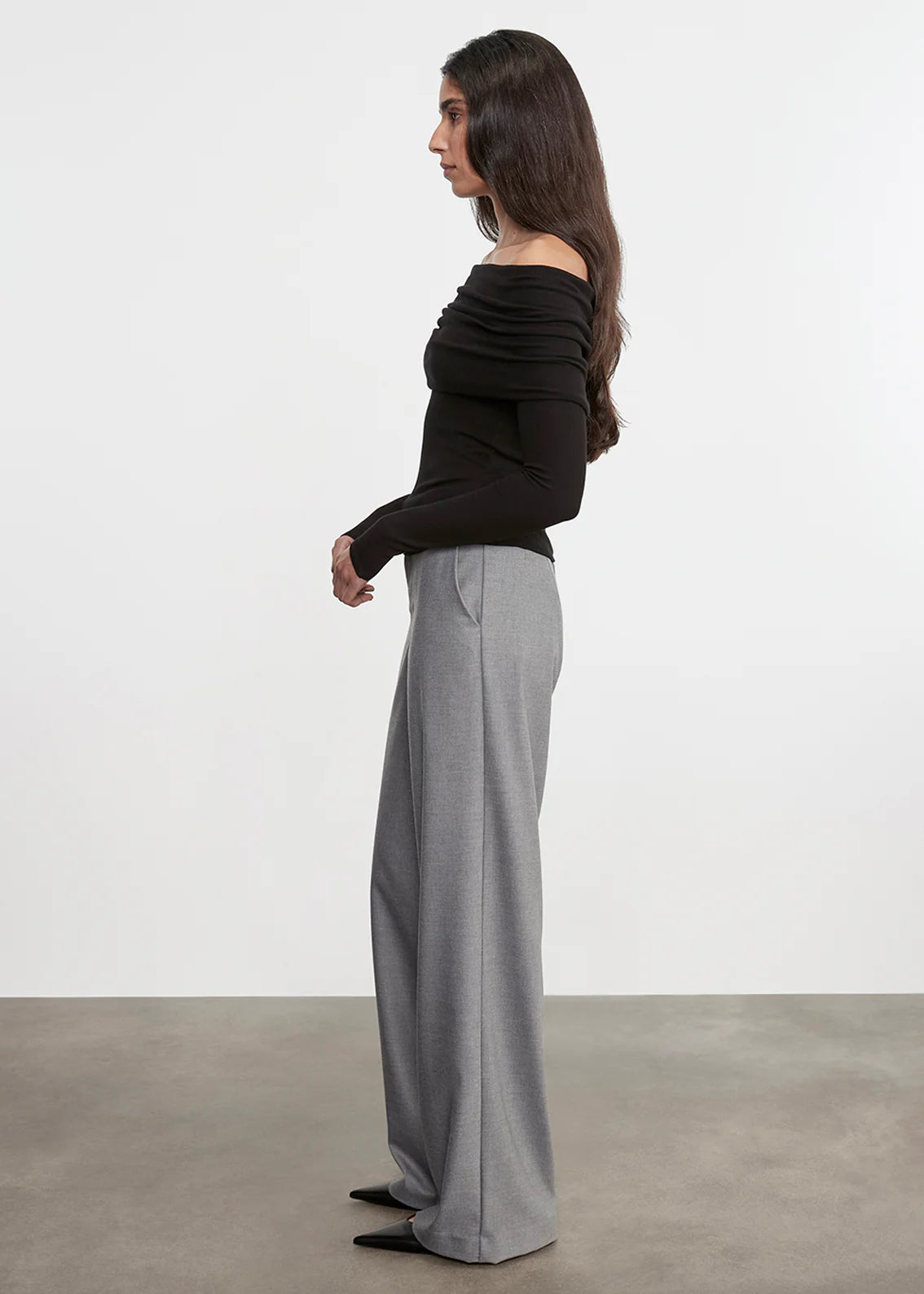 Off-shoulder top featuring a gathered neckline and fitted long sleeves. Made from a signature silk blend for a close, comfortable fit.