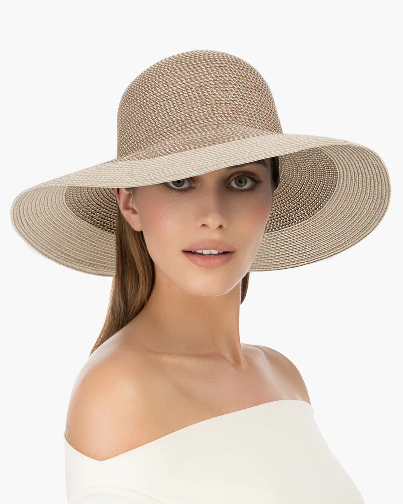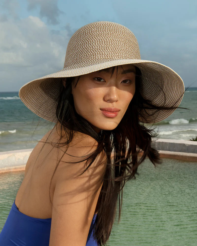 A versatile women's skimmer of our patented Squishee® packable straw with a contrast border that frames the face. Eric's desire to create a simple, striking sun hat that would take you from morning to sundown, resulted in this design. Whether you are strolling the beach or attending a poolside brunch, you will look your best and have the security of protecting your skin.