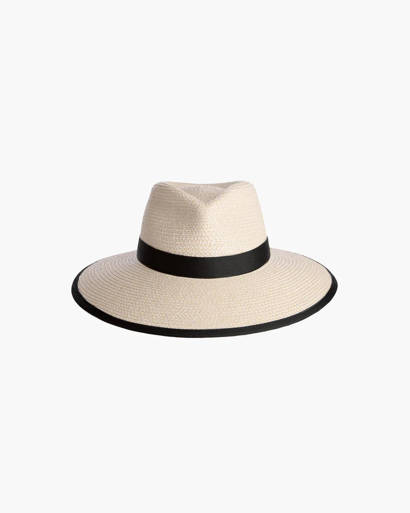 The Suncrest cream black visor is a stylish hybrid of a classic fedora and a practical visor with a generous 4-inch brim. This fashionable Squishee® straw hat is trimmed with grosgrain ribbon for a chic, polished look. You'll turn heads wherever you go this summer.