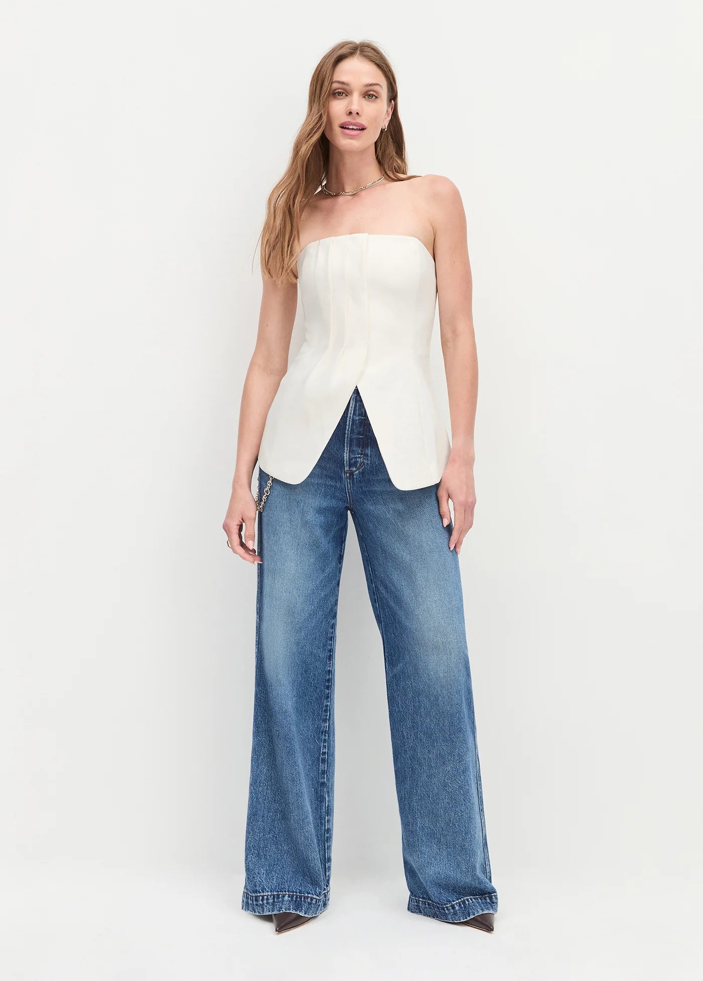 The one that doesn't wait around. Our strapless bustier top with front pleat details, a body-skimming fit, and slight opening at the hem. Cut from a lightweight suiting blend with just enough stretch (because comfort counts). For a favorite look, pair with The Odessa Pant.