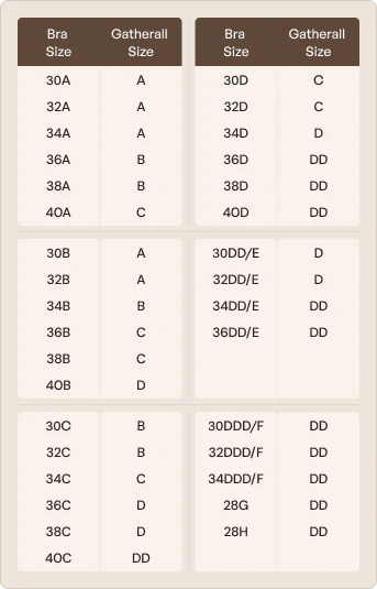 *Compare your regular bra size with our size chart below* Gatherall bra is more than a bra - it’s a patented reusable and washable adhesive silicone bra that gives you strapless, backless, wireless, washable, reusable and flexible support. Here to uplift breasts and women of all naturally beautiful shapes and sizes.