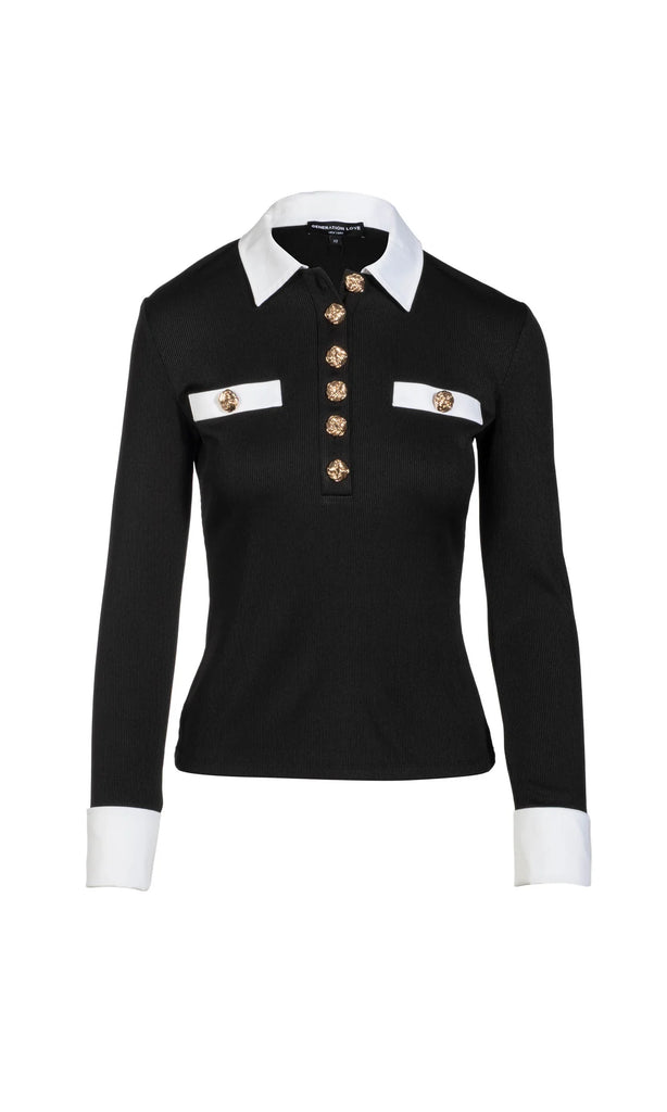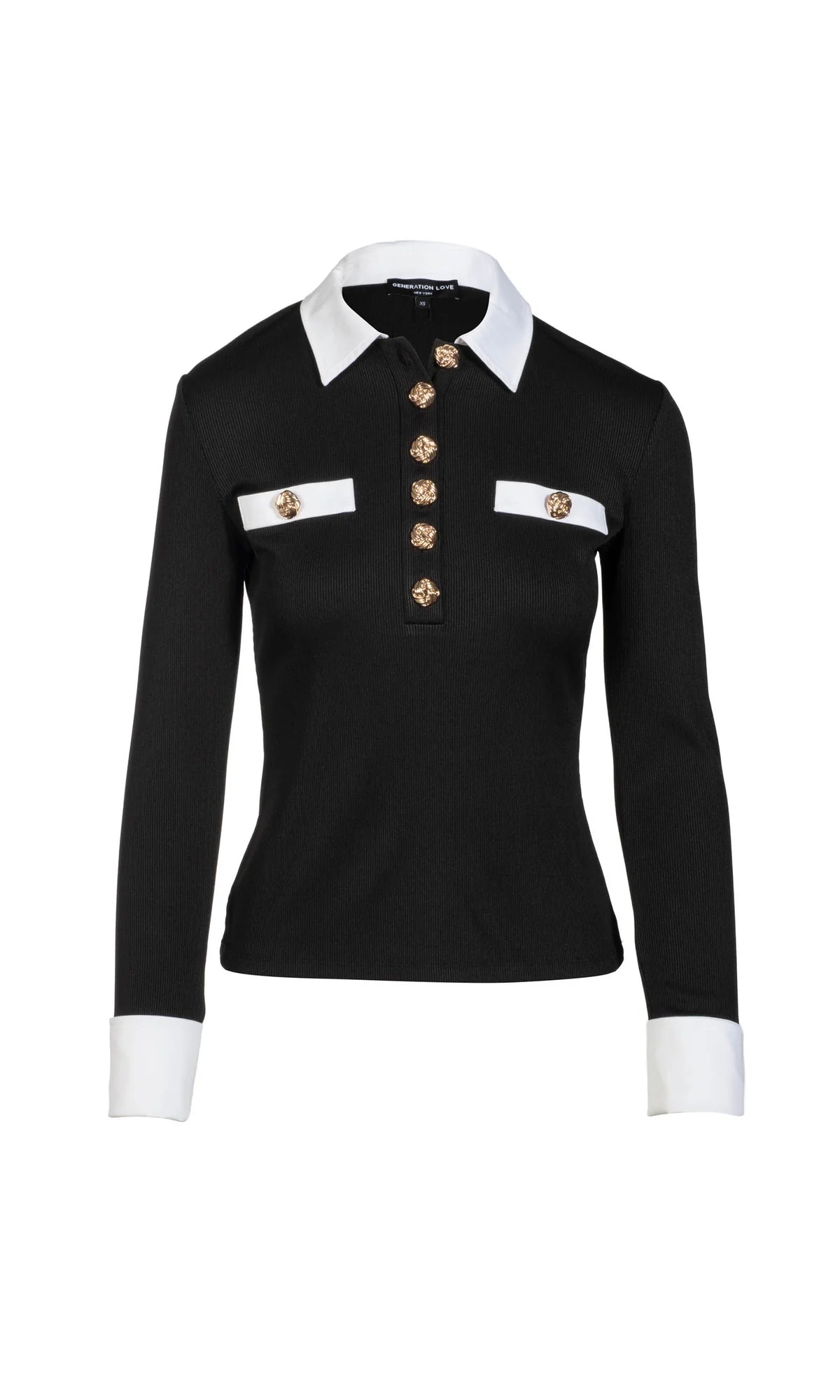 Classic and timeless, this fine rib top features contrast poplin details and gold knot buttons for a striking finish. An essential for fall, it pairs effortlessly with tailored trousers, sleek skirts, or casual denim for polished looks.