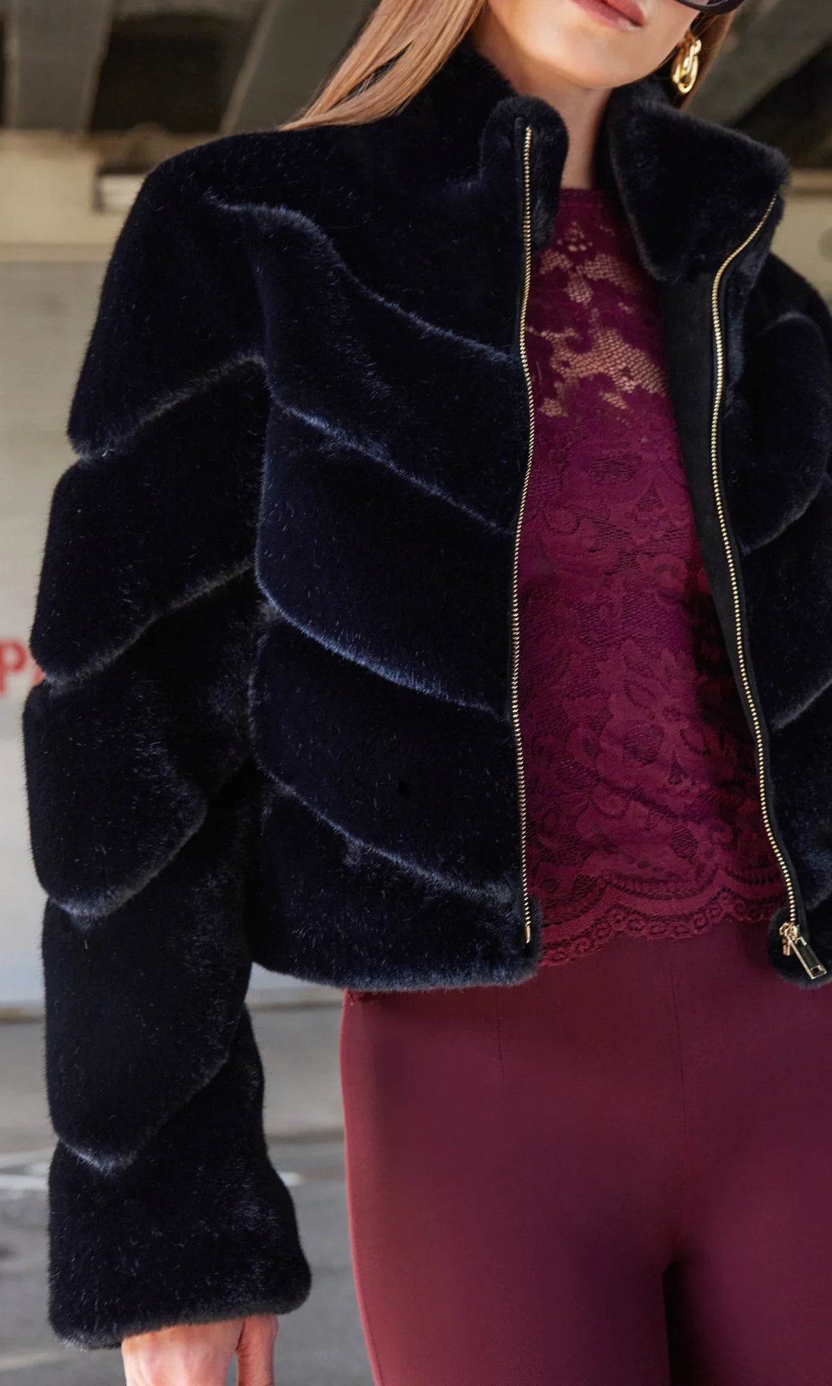 High style meets cozy comfort in this cropped faux fur jacket, featuring a refined high neckline and a striking chevron design. A statement layer you'll return to all season long.