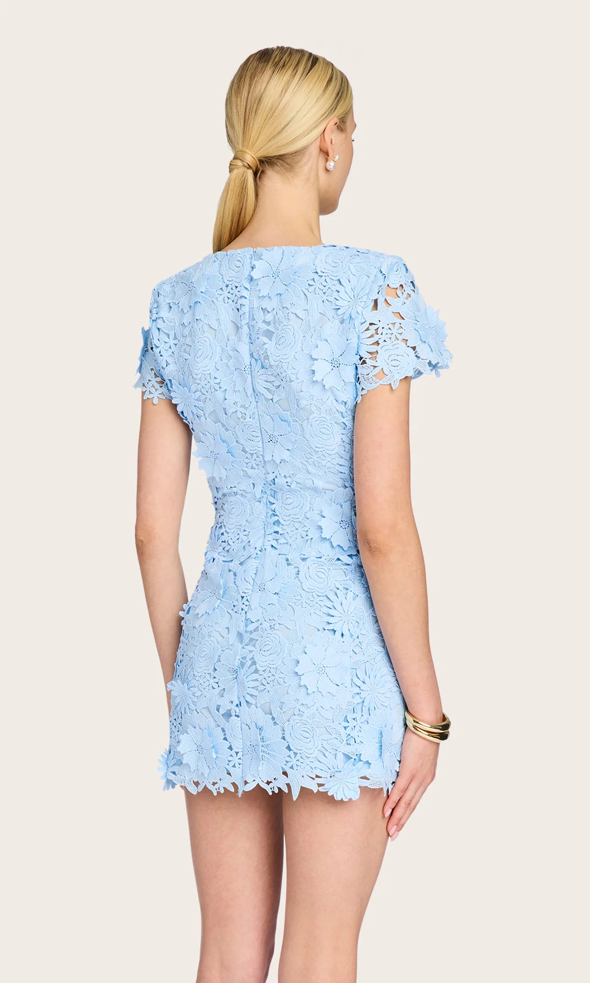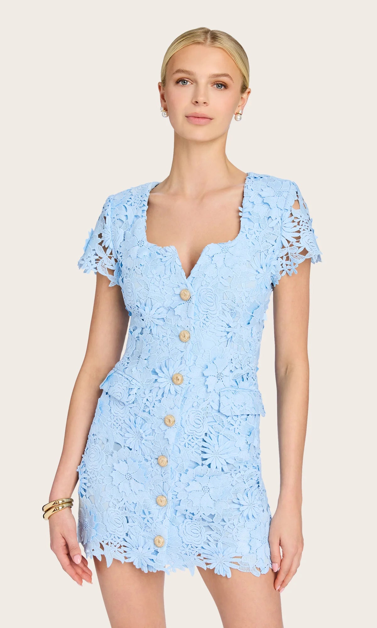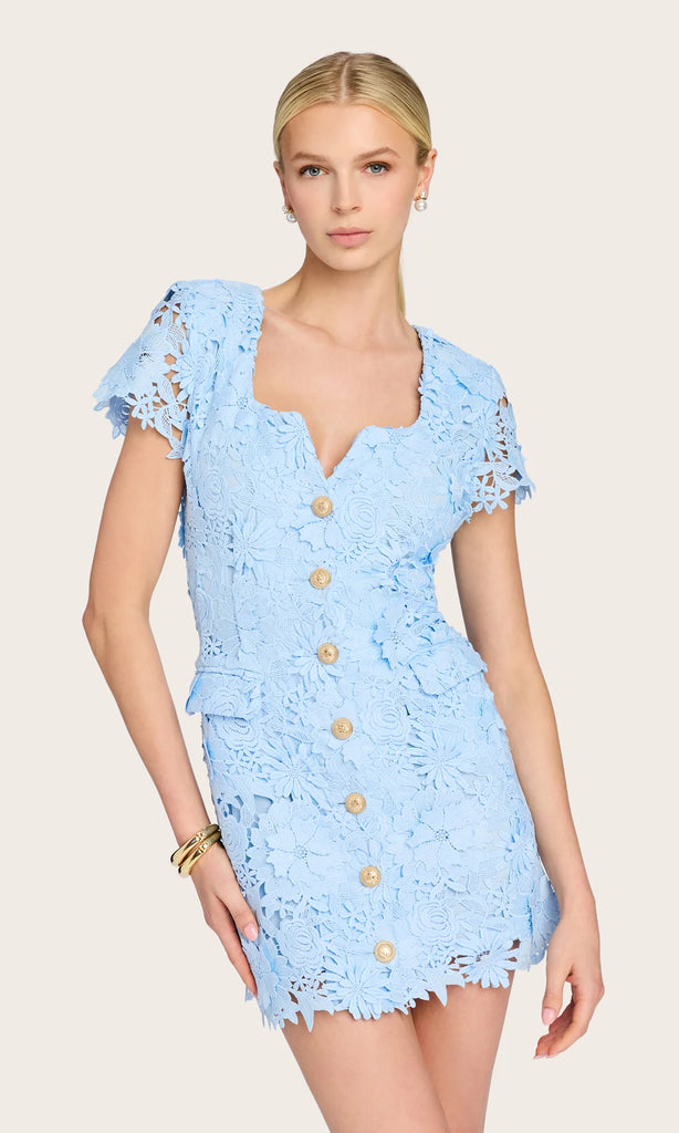 Floral Guipure lace brings rich texture to this chic button-down mini dress, while a V-notch neckline adds a modern touch. Both polished and statement-making, it's a standout choice for workdays and beyond.