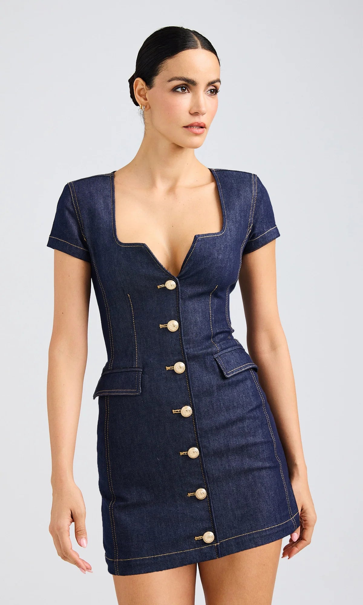 This button-down mini dress effortlessly features our sheen denim fabric, offering a fresh take on classic design. The v-notch detail at the neckline further refines the look, making it the perfect canvas for showcasing your favorite jewelry.
