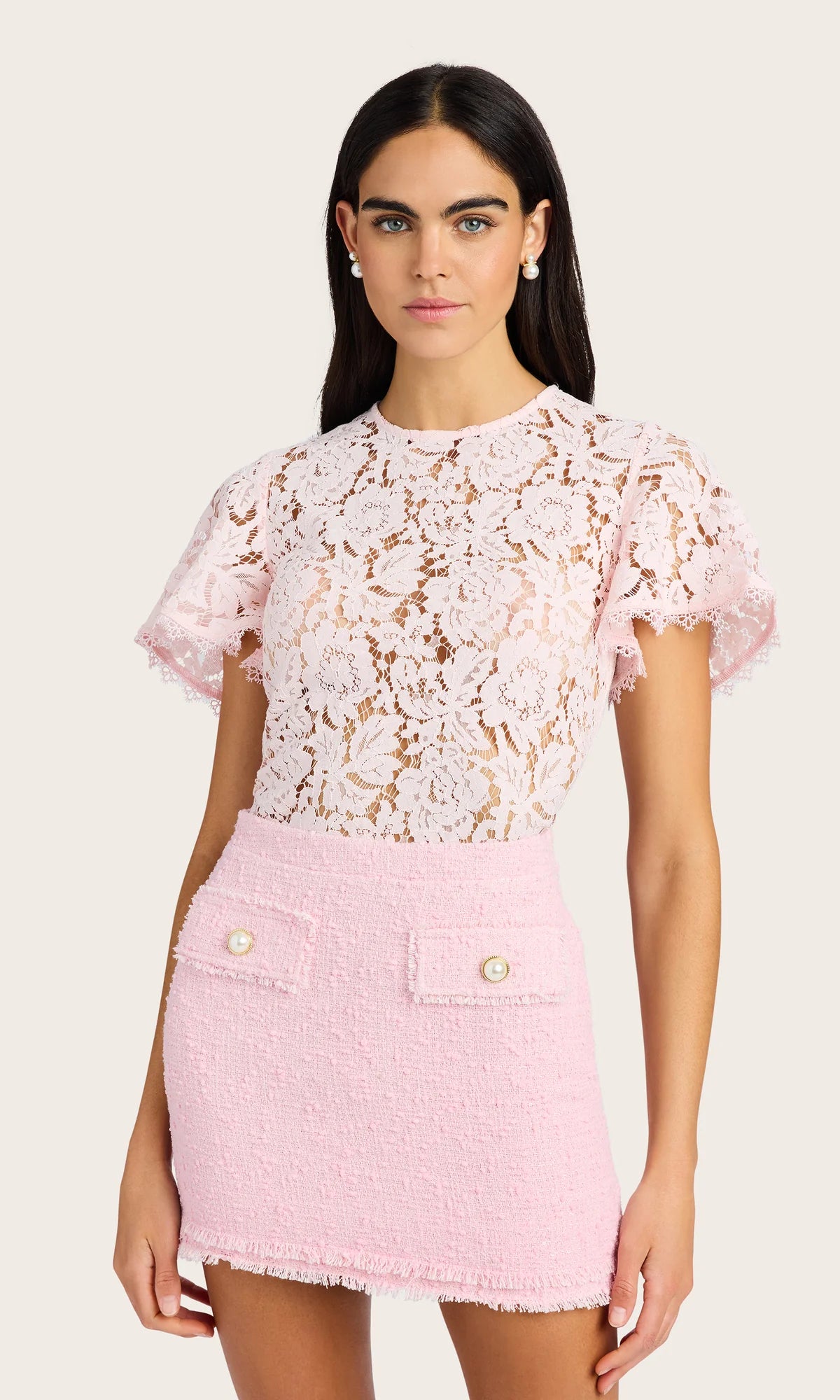 Semi-sheer petal pink floral lace meets crew neck t-shirt styling in this charming top. Scalloped eyelash lace at the sleeves and hem adds a touch of romance. Pair it with jeans for a chic look or with skirts for a contemporary vibe.