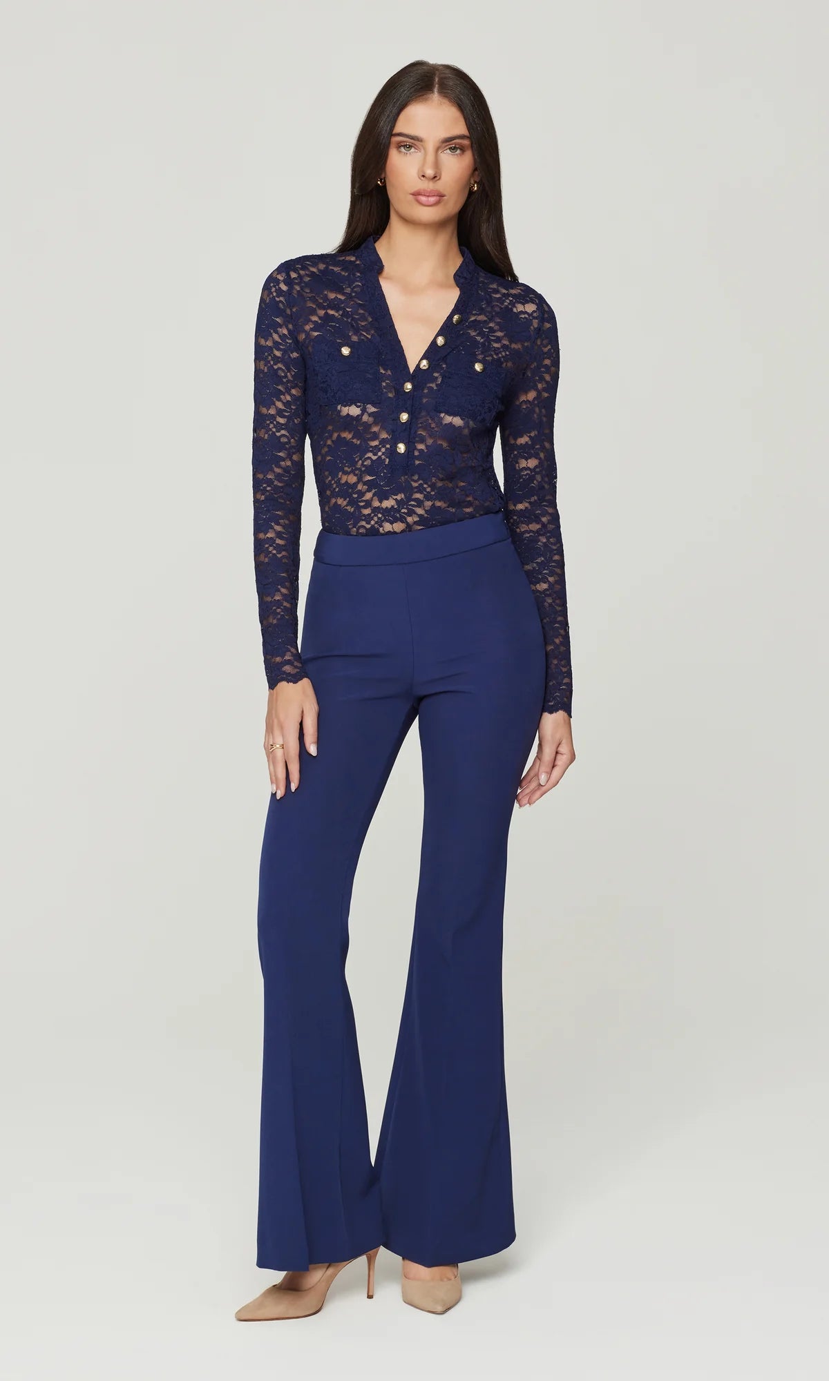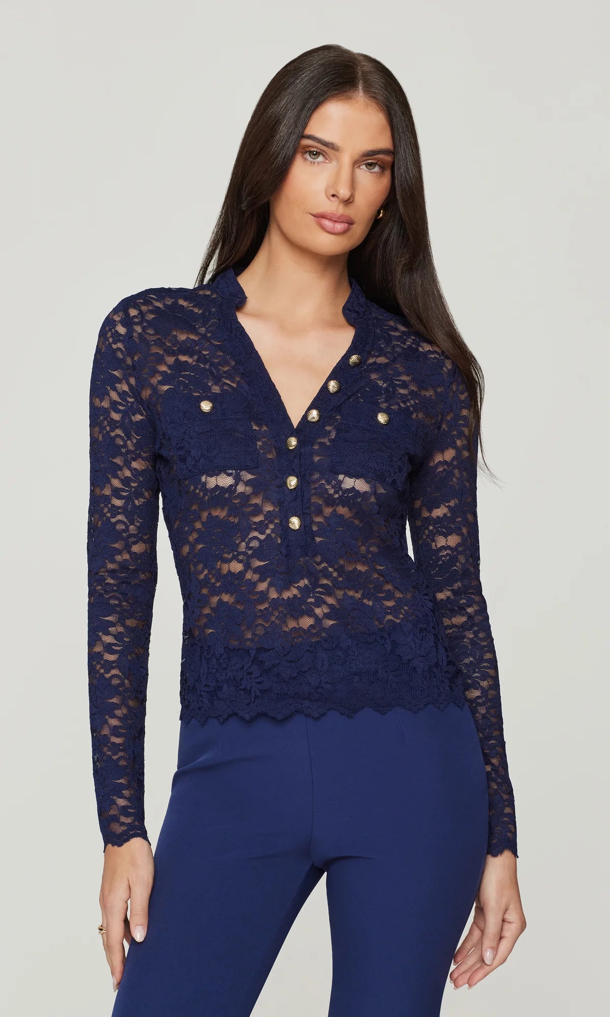 The Ilona Lace Top in navy is crafted in delicate stretch lace in a henley style for a tailored yet romantic effect. Its button-front design and butted-patch pockets give it an upgraded blouse-like interpretation of classic lace. This versatile piece brings texture to everything from denim to suiting.