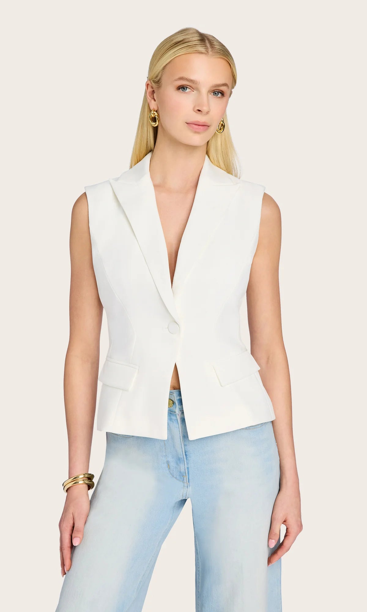 Blending the sharp structure of a single-breasted crepe blazer with the flattering silhouette of a cinched-waist sleeveless top, this piece pairs perfectly with pants or skirts for a sophisticated look.