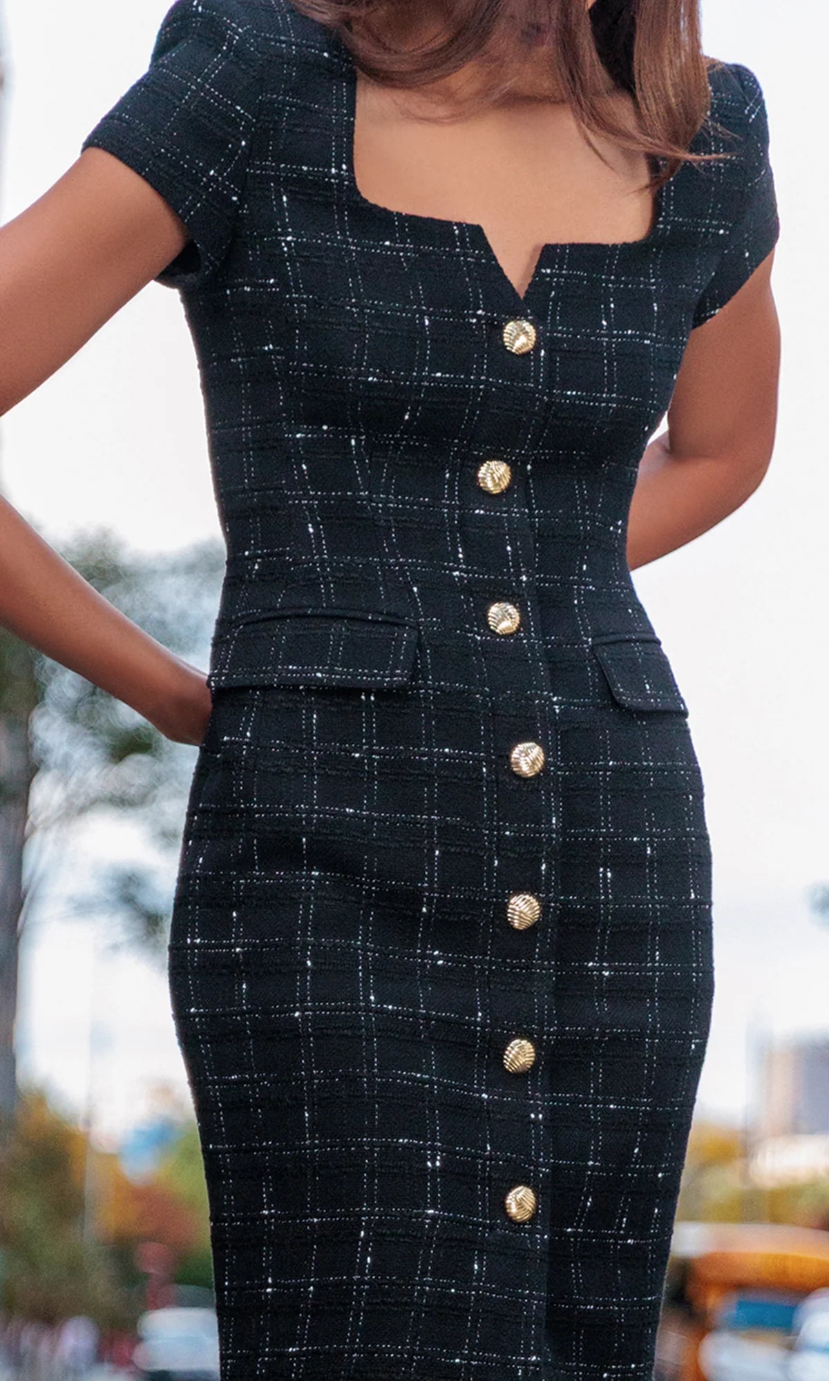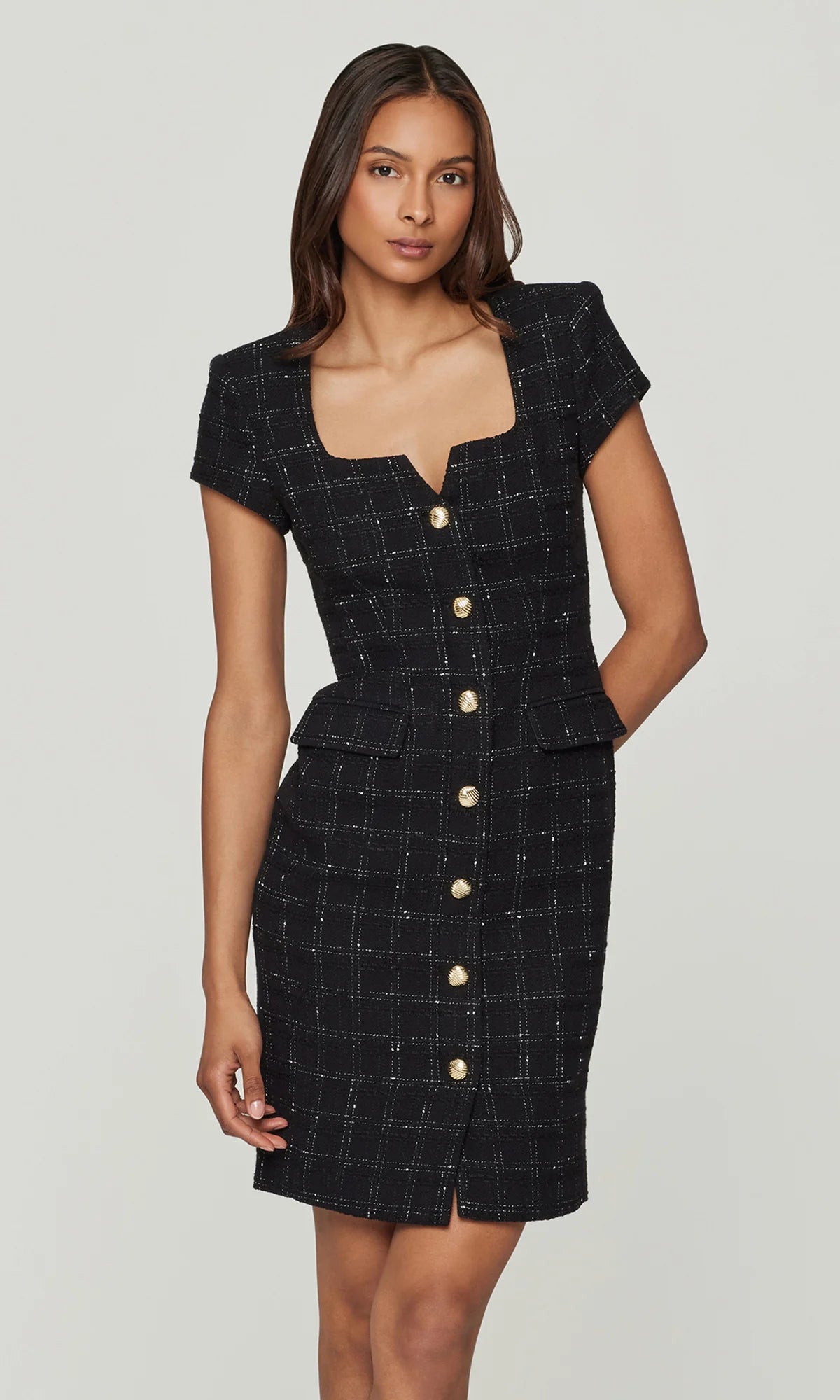 The Sierra Windowpane Tweed Dress delivers structured sophistication with its tailored square neckline, cap sleeves, and sculpted waist. Crafted from textured black & white windowpane tweed, it offers a modern interpretation of classic check patterns.