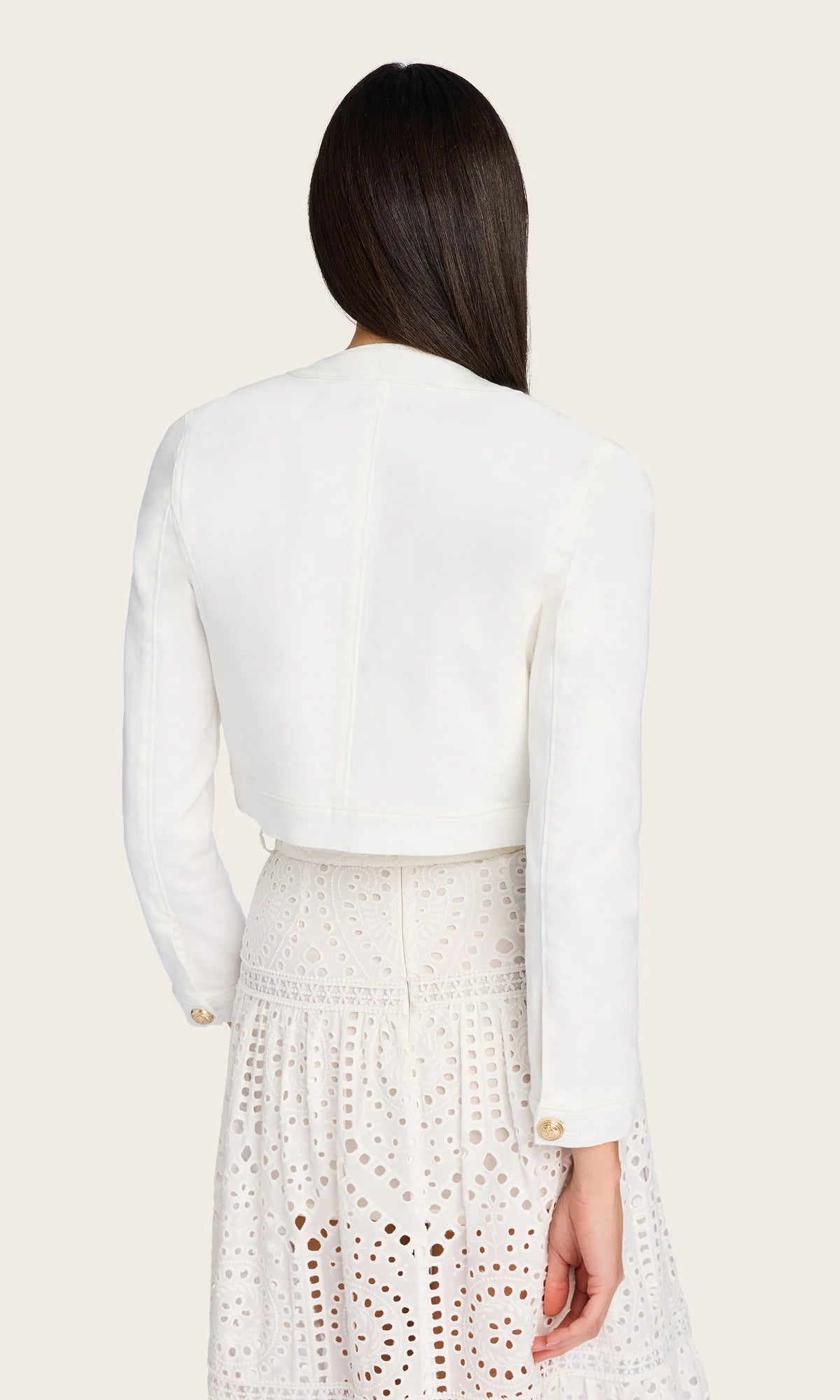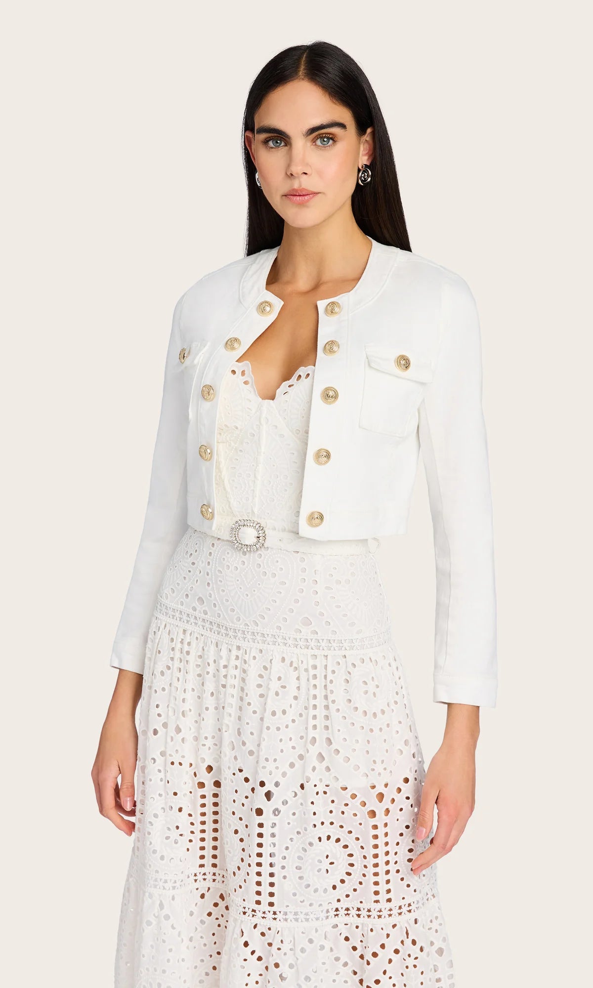 This denim jacket reimagines a classic with a contemporary design featuring decorative buttons, patch pockets, and a cropped, collarless silhouette.