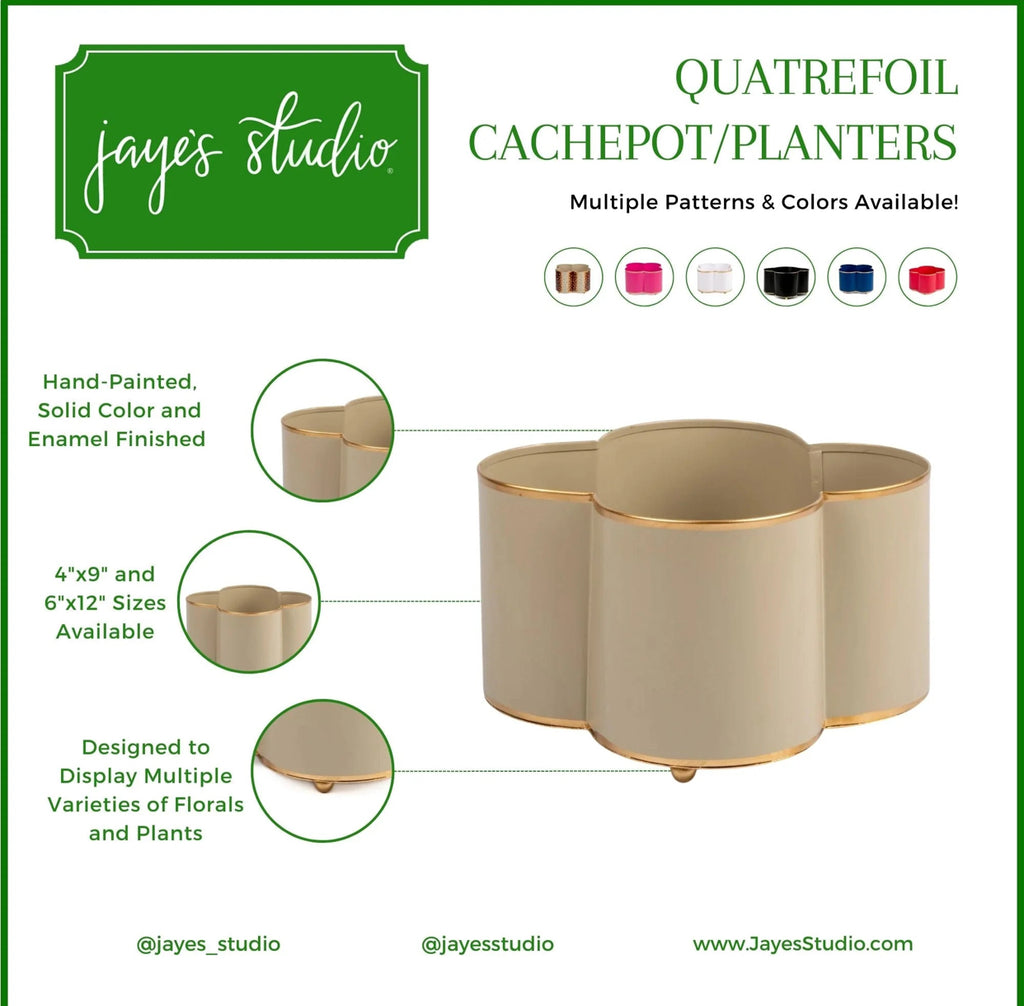 Our quatrefoil cachepot planters are created with a metal base and detailed with exceptional hand-craftsmanship. This ensures that you can enjoy our cachepots functionality and beauty for many years to come.