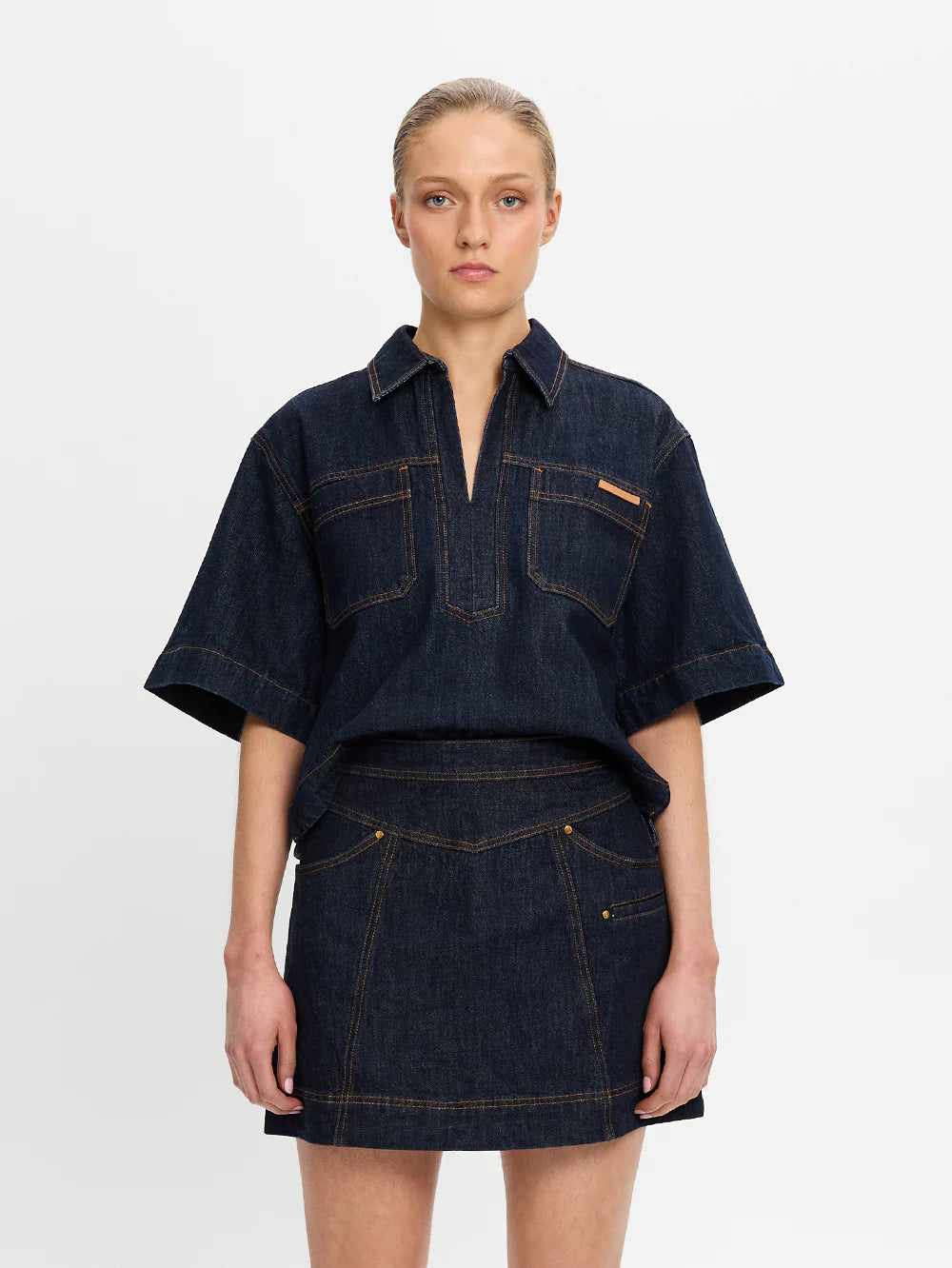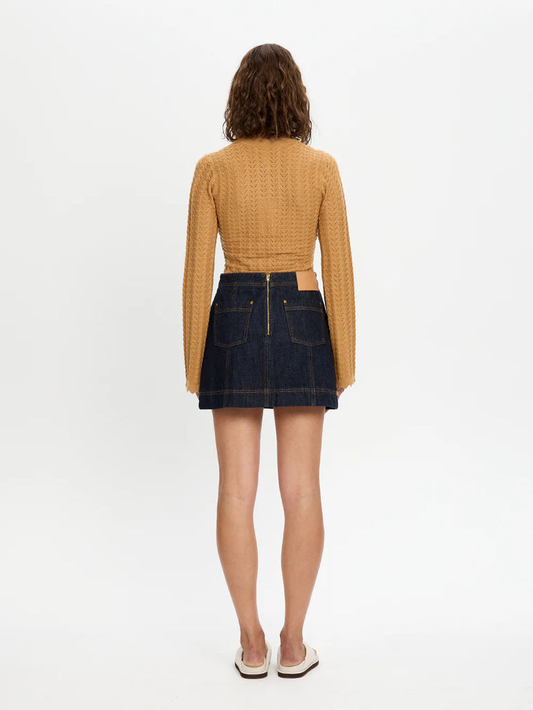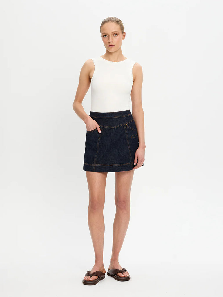 The Immy Denim Mini Skirt in raw indigo is a fitted A-line skirt featuring panel seams with contrast stitching, patch pockets and complete with signature hardware and leather patch.