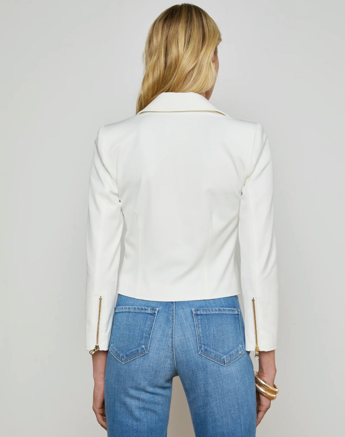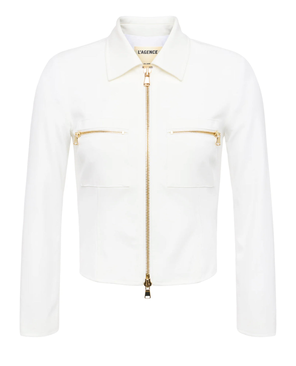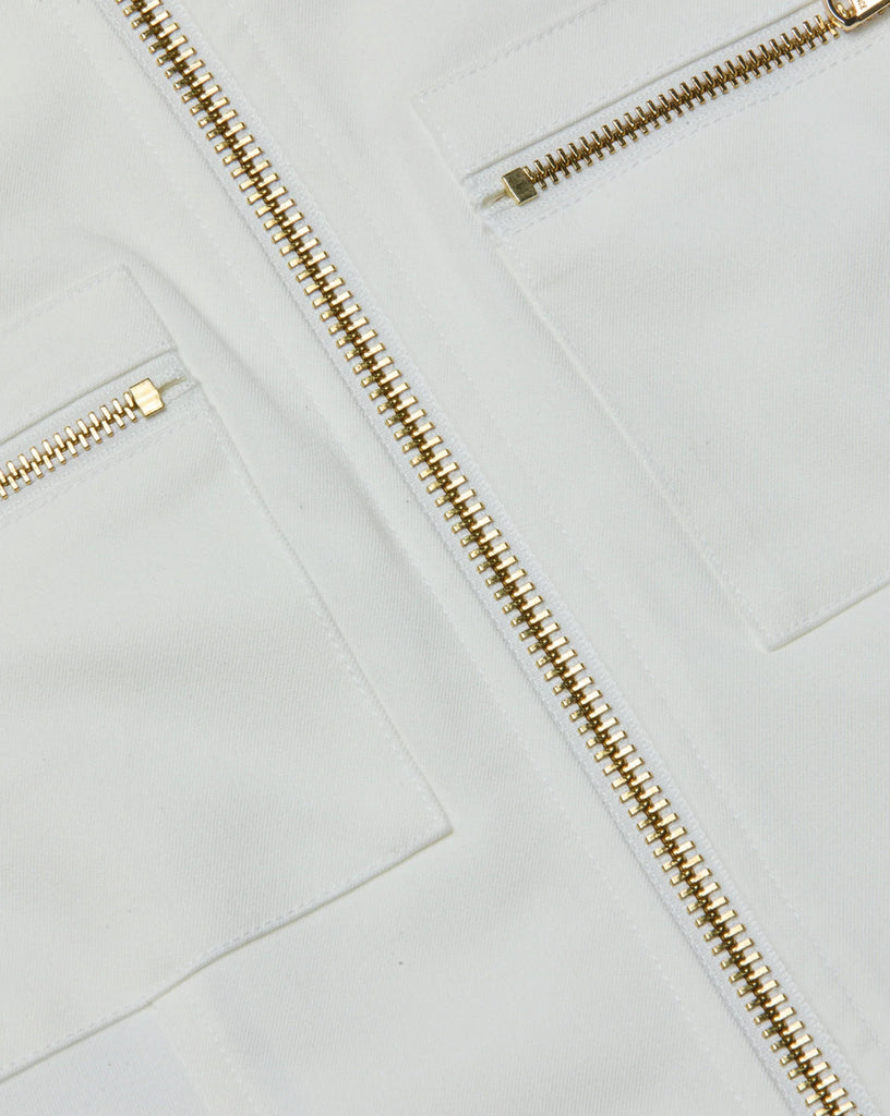 The Calianna is a crisp white shirt jacket, elevated with gold zip detailing for contrast and edge. Where the Calinna on its own as a top with your favorite jeans or size up to wear it as a jacket over a camisole.