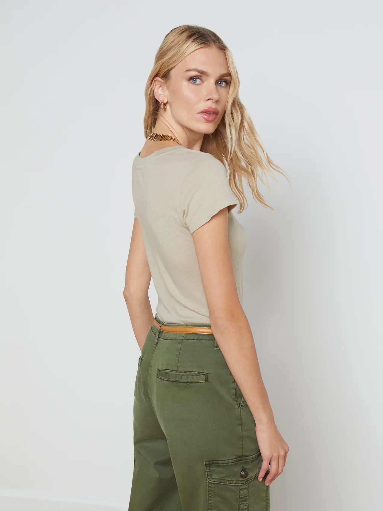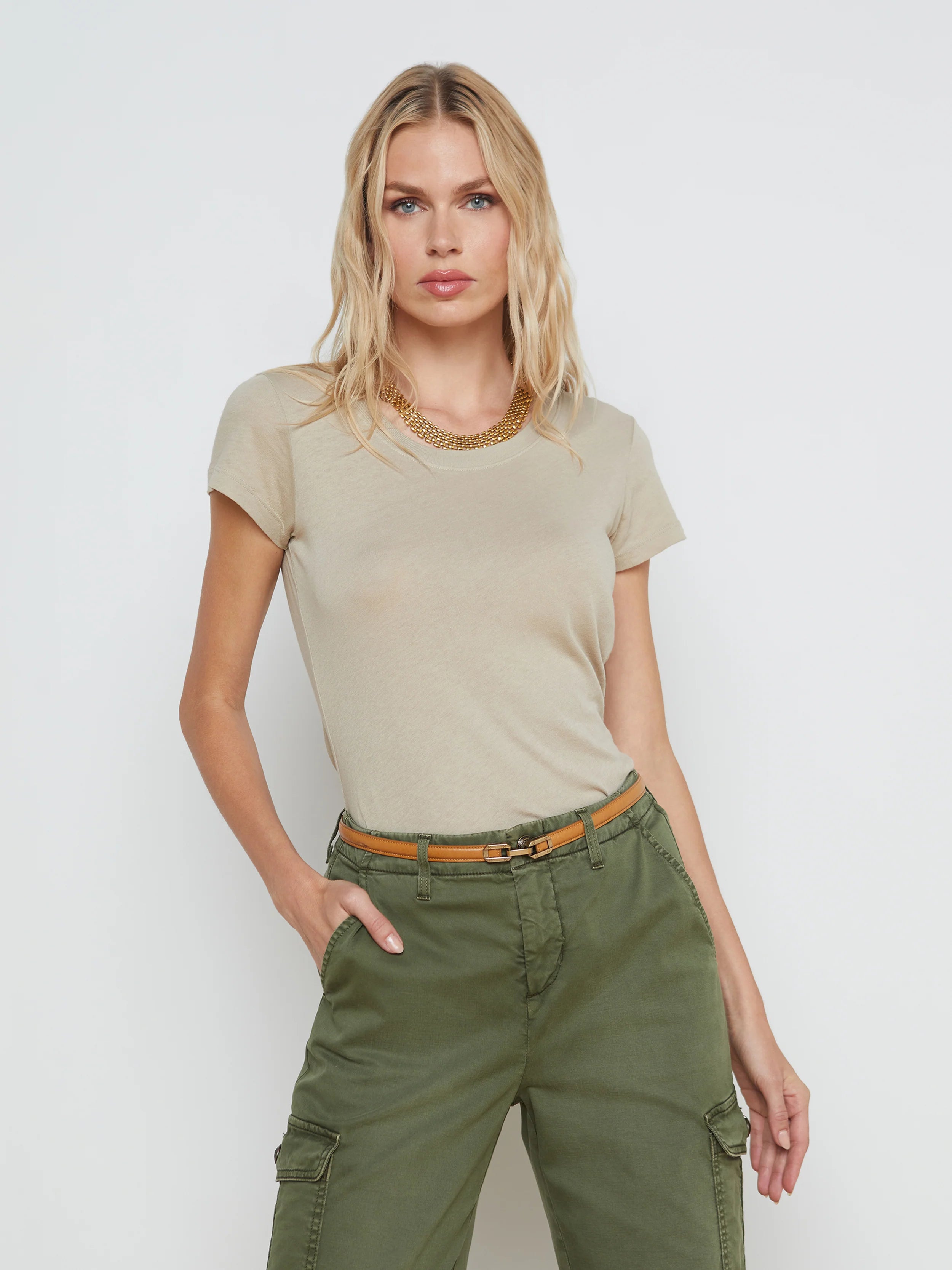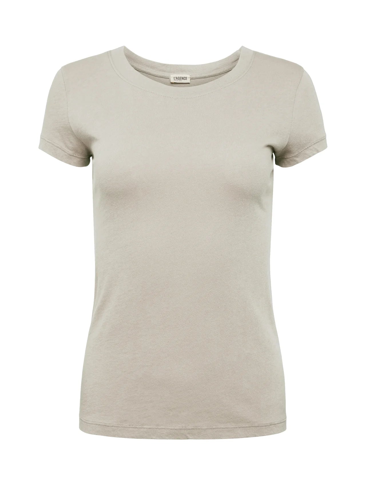 A classic cut, taupe tee defined by an understated, wide scoop neck and short sleeves is crafted from super soft cotton with a light hand and a flattering silhouette. The slim fit and subtle neckline make this closet-staple an ideal base layer.