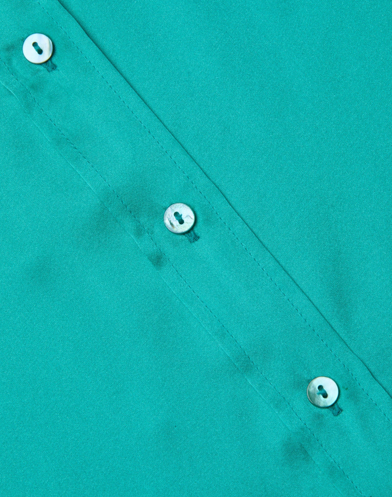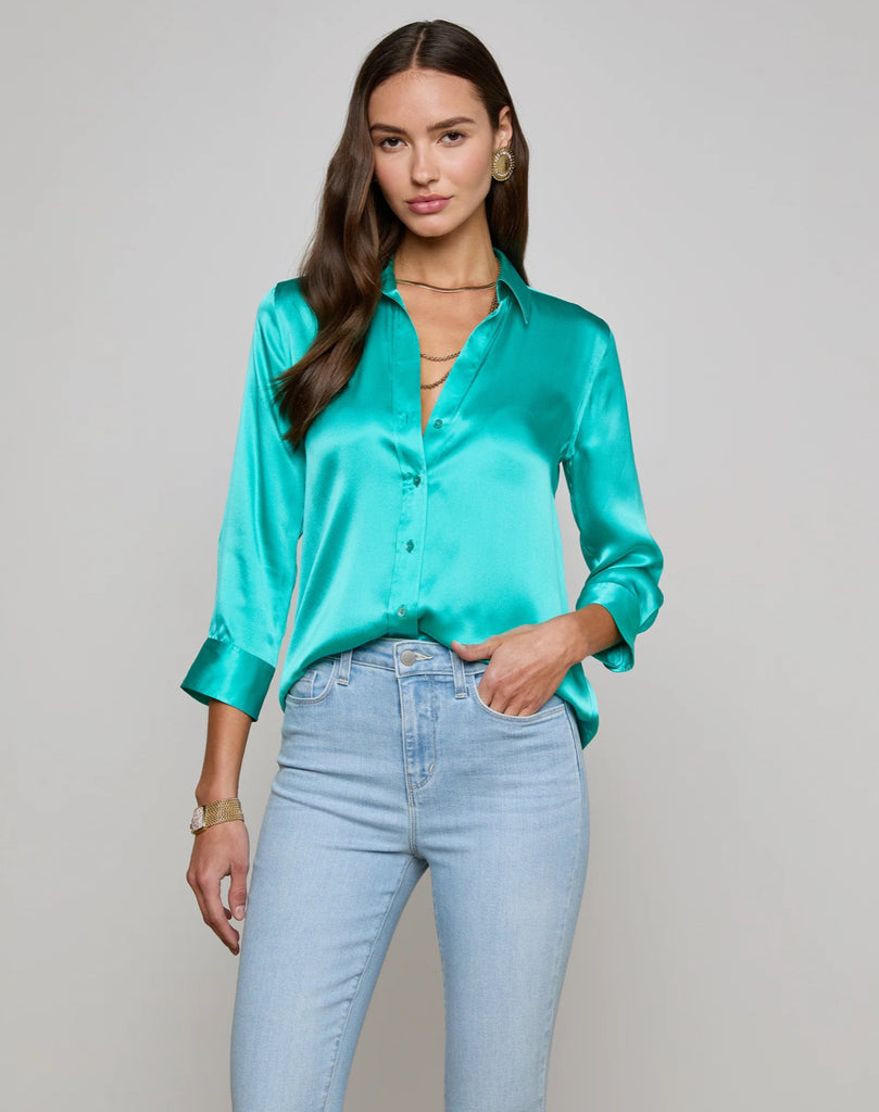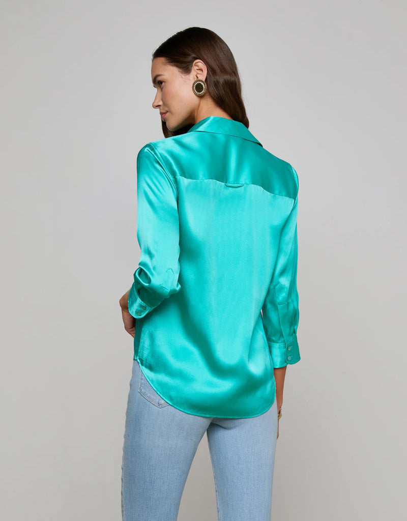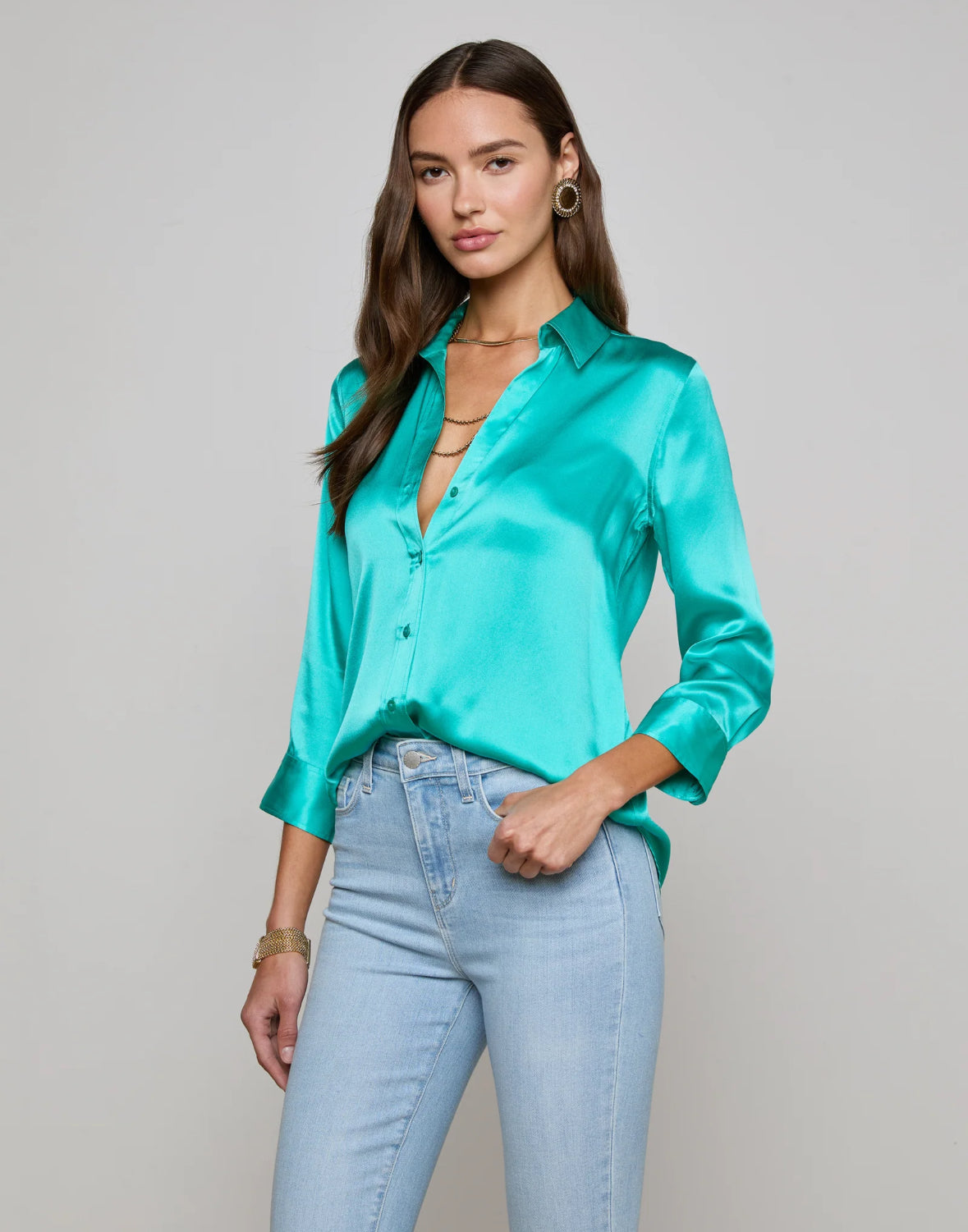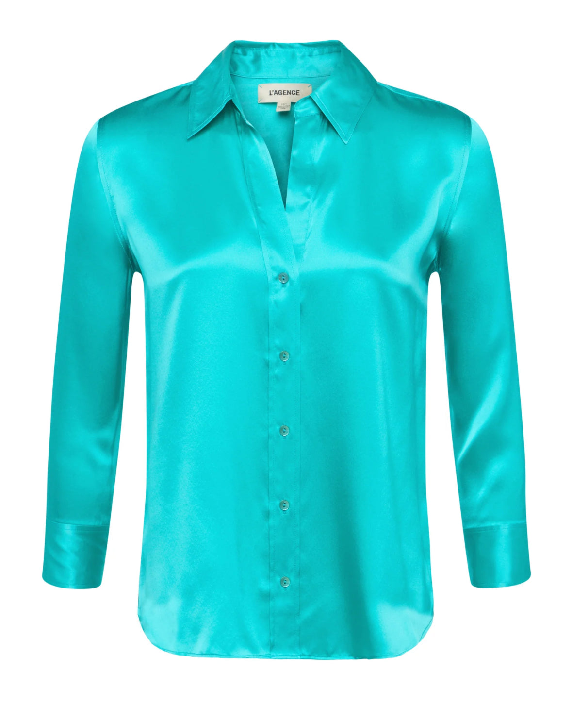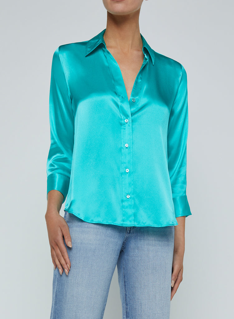Meet the iconic silk button-down that belongs in every wardrobe. Our signature three-quarter sleeve shirt is back in pool blue.