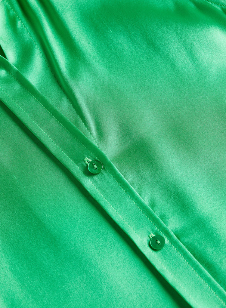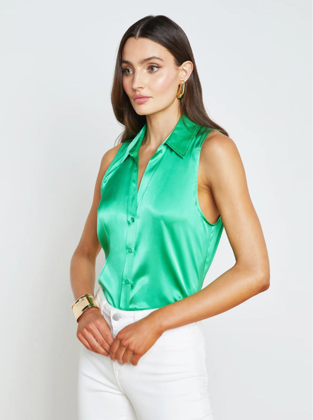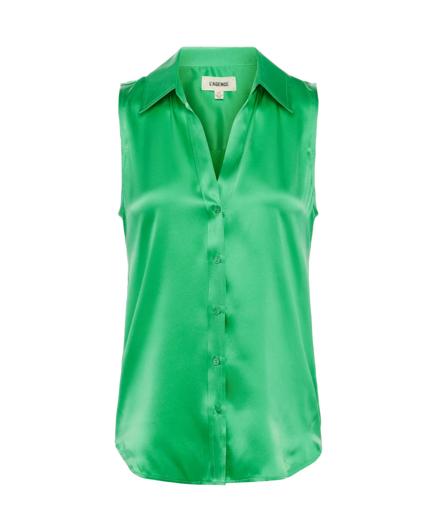 Your essential sleeveless silk blouse, now in bright green. The Emmy button-down blouse balances a relaxed fit with classic shirting details like smart collar, back yoke with look, and high-low shirttail hem. Pair with vintage wash denim for a fresh pop of summer color. For office-approved style, wear it with a tailored pant.