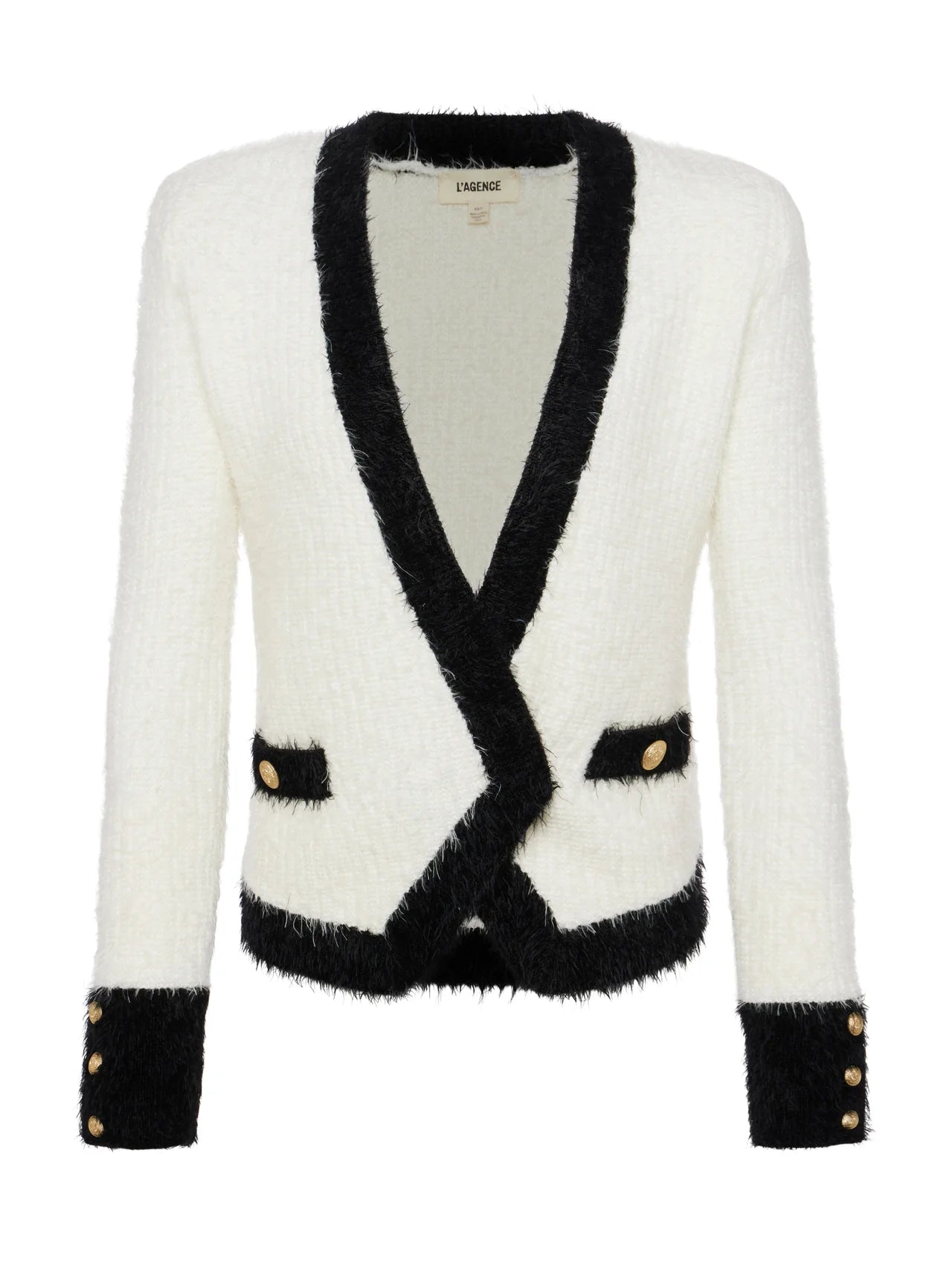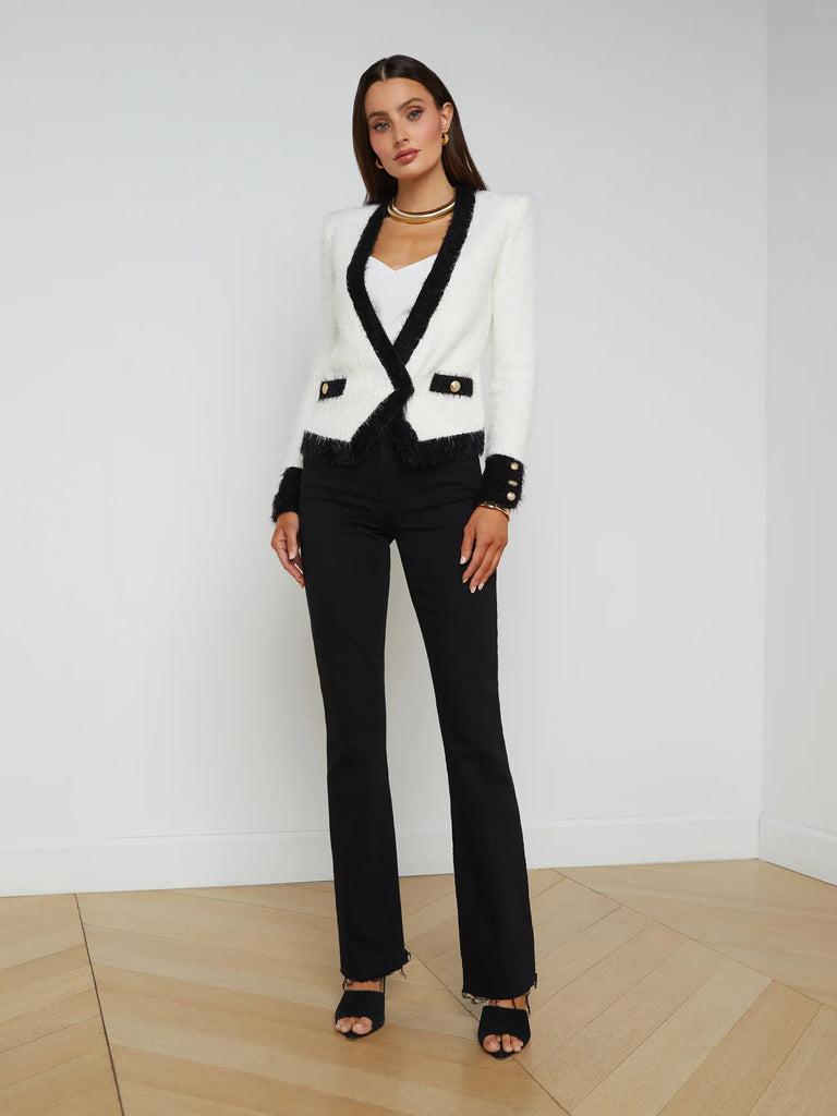 With a sculpted silhouette and deep V-neckline, the Georgia cardigan blazer effortlessly complements the figure. Two tones and a textural stitch complement the super-soft hand of the premium fuzzy knit. Faux pockets, cuffs, and our signature embossed-dome buttons add smart, tailored polish. Wear with a minimalist black pant to keep the look sleek.