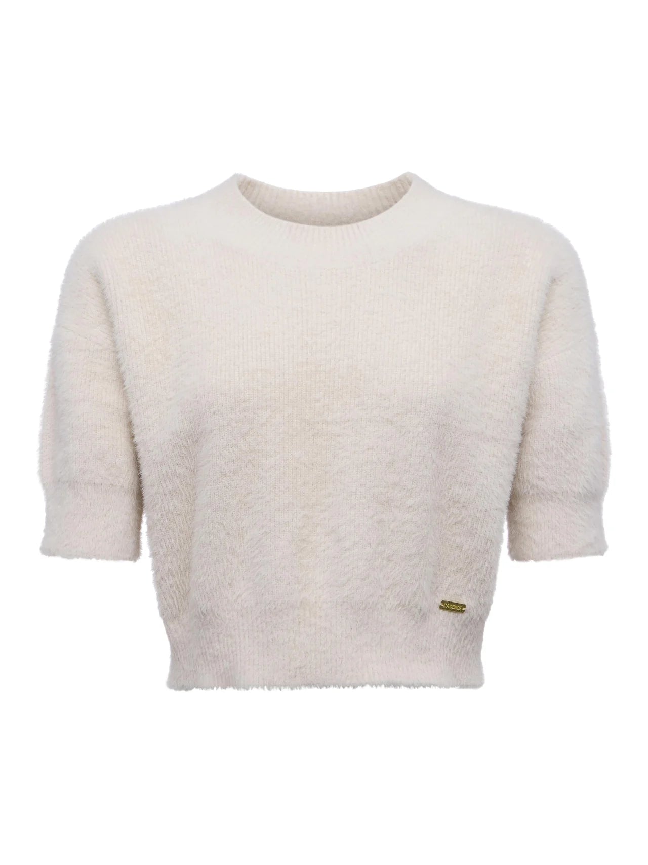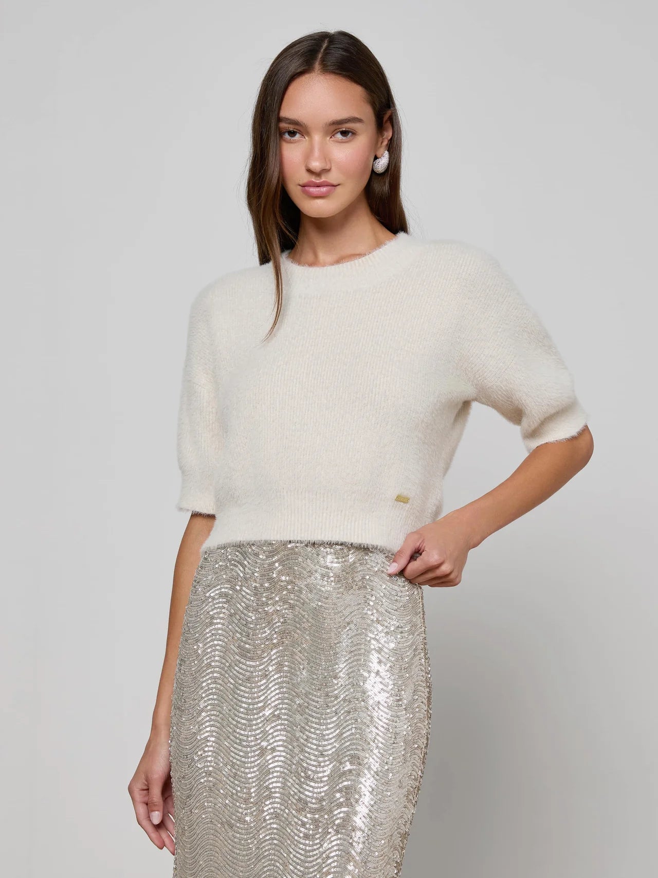 This style debuted at our Fall ‘25 NYFW presentation. The Guinevere is a luxe update to the classic crewneck sweater. Spun from an ultra-soft knit, it features a cropped silhouette with short sleeves that make it perfect for transitional wear. The plush texture lends a cozy yet refined feel, while its clean lines keep the look modern. Pair with sequined skirts for evening glamour, or style with high-waisted denim for an elevated off-duty ensemble.