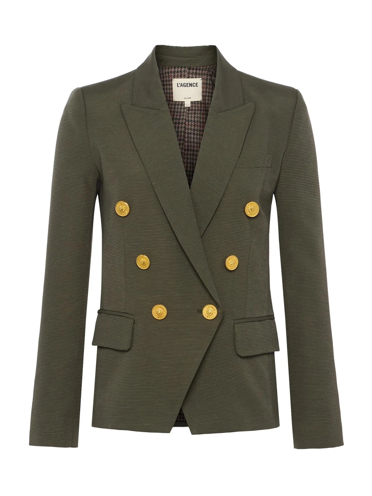 Our super-sculpted Kenzie blazer is a L’AGENCE classic and a bestseller season after season, featuring a tailored slim fit. Now reimagined in a deep olive ribbed fabric that feels as good as it looks. Its sharp double-breasted silhouette is balanced by soft, flexible structure for effortless wear. Gold crest buttons bring standout polish, and flap pockets keep it classic. Dress it down with denim or throw it over your favorite slip dress.